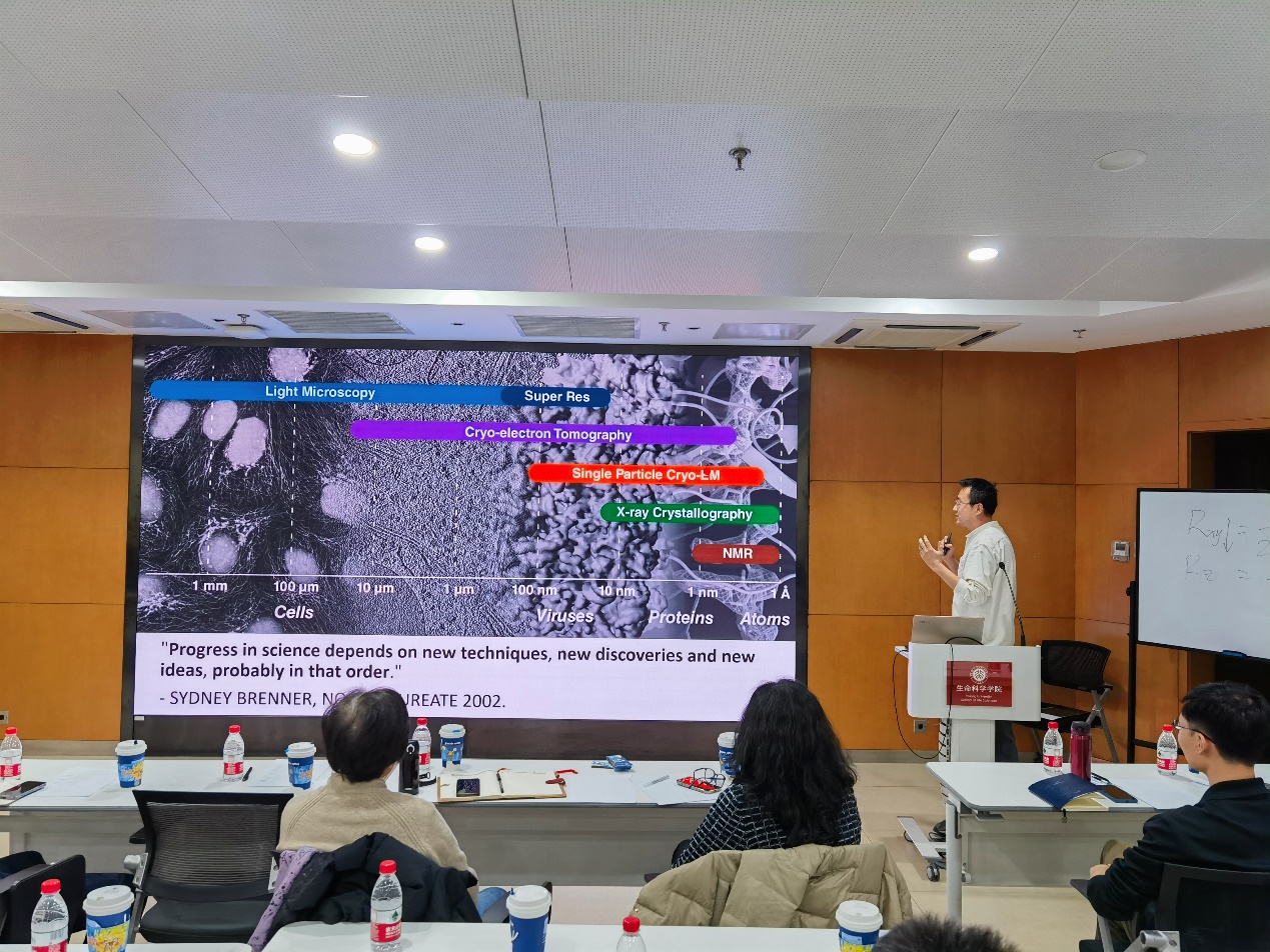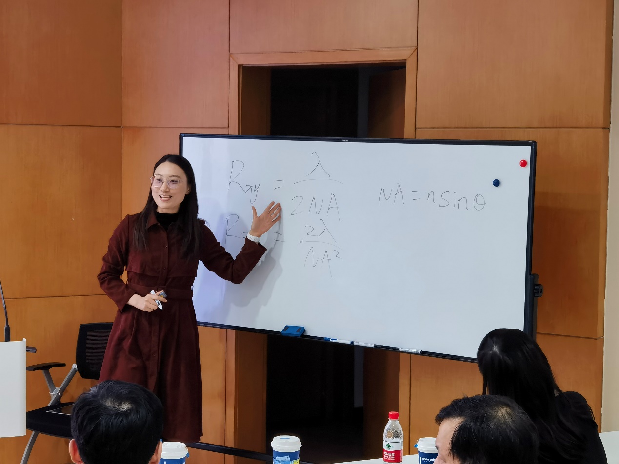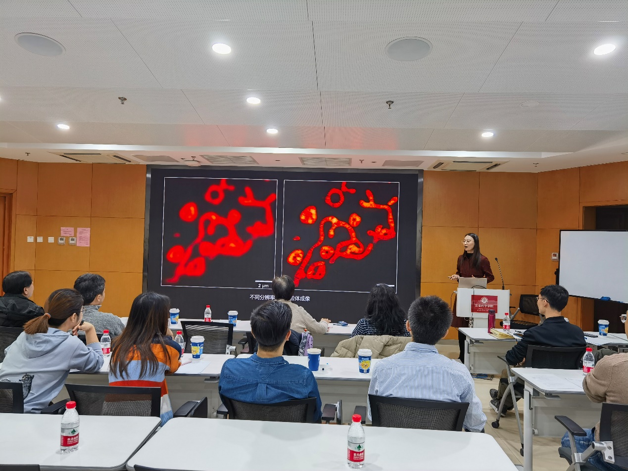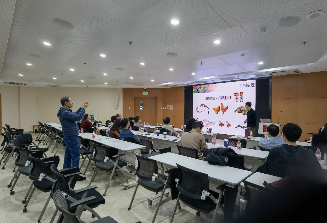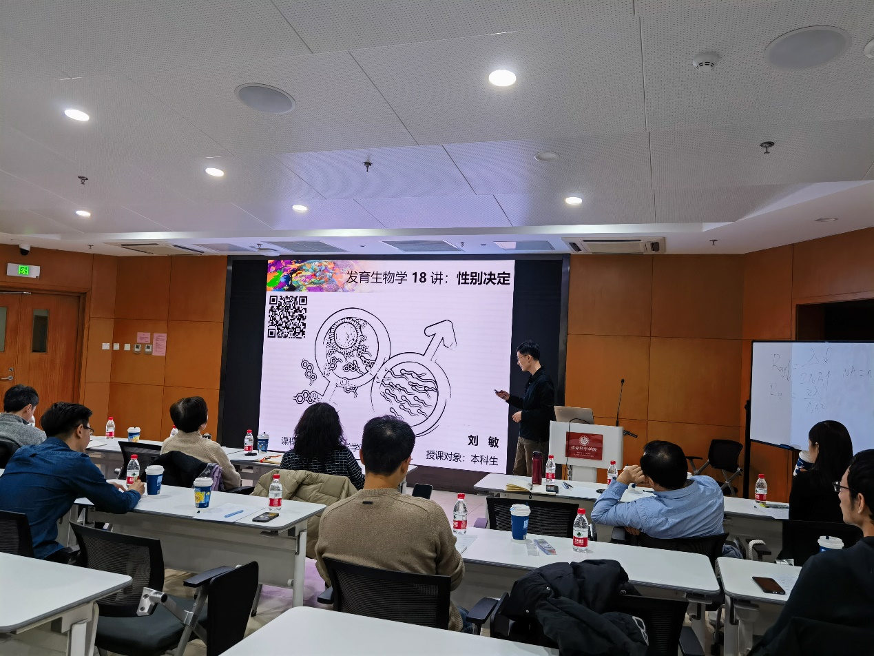 承担《生物荧光成像实验》课程的李美琪老师首先出场,以第四讲“超分辨荧光显微镜搭建”为题,从光学衍射极限和成像分辨率入手,引入超分辨荧光显微成像的概念与实现方法;然后利用两张带条纹的纸作为道具,形象地展示了结构光照明原理;最后重点介绍了结构光照明显微镜的搭建过程,深入浅出,表述流畅。承担《发育生物学》课程的刘敏老师以“性别决定”为题,开场引入小丑鱼尼莫的故事,抓住了大家对生男生女的兴趣,体现了课程的趣味性;然后围绕性别决定的研究历史以及性别决定因子的充分性和必要性等问题娓娓道来,逻辑清晰,展现了多姿多彩的性别决定模式。承担《三维生物电镜实验技术》课程的郭强老师的演讲题目是“亚细胞结构三维原位成像”,以西瓜为例详细介绍了如何使用电子显微镜解析生物体的细微结构,生动形象,内容充实。台上的老师演讲时,在台下观摩的师生认真听课,积极配合提问与互动;试讲结束后,台下的师生纷纷提出自己的意见和建议,从授课提纲、授课节奏、授课内容的完整性与前后呼应、教具展示、板书设计、师生互动、思政因素融合等多方面为参赛老师出谋划策,会场讨论热烈,笑声不断。两个多小时的研讨会很快就结束了,不少老师仍意犹未尽,继续留下来切磋、交流。演讲的老师和观摩的师生均表示此次研讨会收获很大,期待继续参加类似的活动。李美琪、刘敏和郭强三位老师都表示此次活动增强了他们参赛的信心,预祝三位老师在即将到来的正式比赛中共创佳绩!
