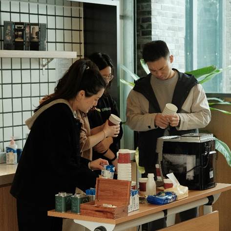 三层空间以手冲咖啡体验为主,40多位学生和博士后积极参加。挪瓦咖啡师向大家讲述咖啡豆的种类、烘焙方式以及风味特点,现场展示手冲咖啡的制作过程,悉心教授手冲咖啡适合的水温、咖啡研磨度、冲泡时间等制作技巧。多位同学亲自尝试手冲咖啡并彼此分享,大家细细品鉴咖啡的丰富口感和风味。现场活动氛围浓厚,给期中季和就业季的同学们提供了减压体验。