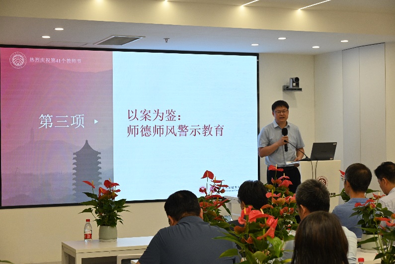 学院党委书记彭建通过真实案例剖析教师队伍中可能存在的风险,与大家共同探讨师德建设的重要性,引导教师以德立身、以德立学,筑牢师德根基。他同时向全体教师送上节日的美好祝愿,希望大家继续弘扬高尚师德,践行育人使命。