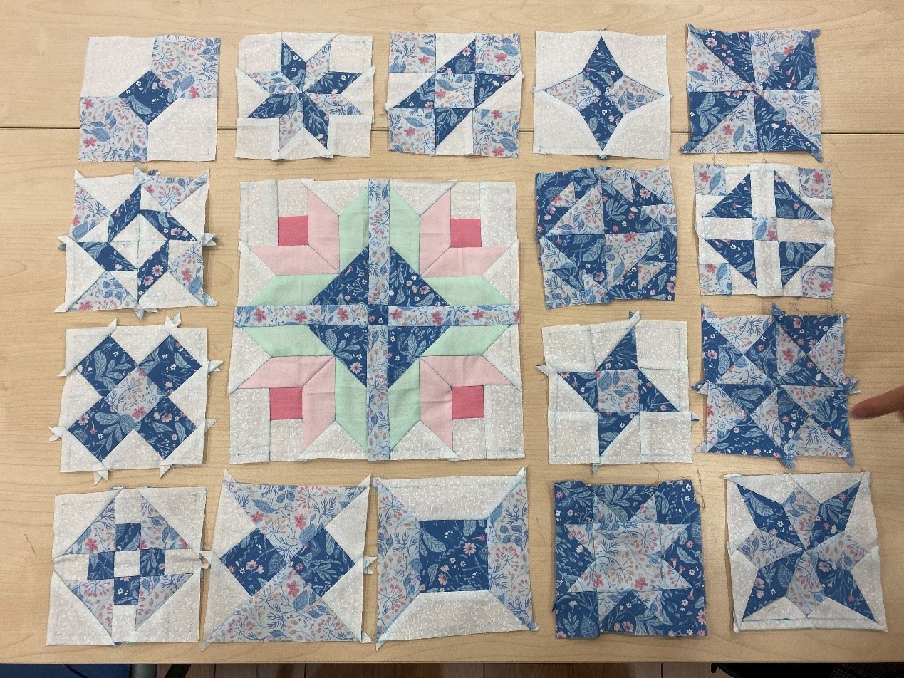 冯洁老师提前制作好缝制图样,并裁剪好布料,活动现场每位老师认领一份材料,芊芊玉手,飞针走线,千针万线传递着对吴老师的深深情谊。小方格布艺完成后,大家纷纷展示自己的作品,相互比较。