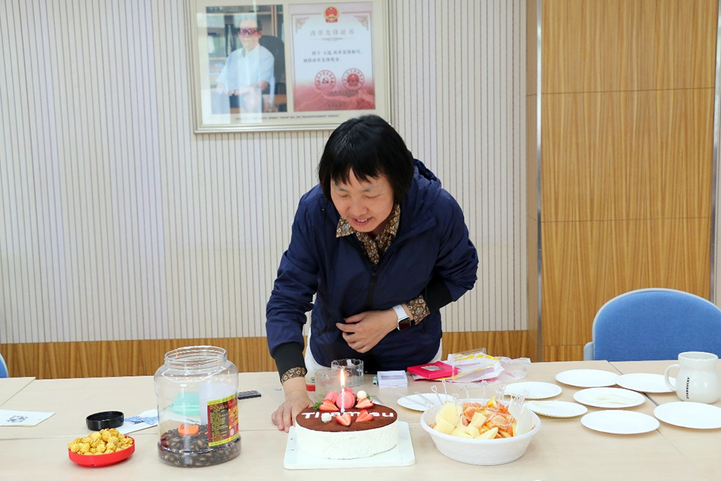 手工制作完成一个段落,休息期间大家开始分享工会为本次活动准备了蛋糕和水果,以及另一份爱心礼物:细心的柏艳红老师收集整理了吴老师工作三十年的青春记忆,制作出一份电子相册。老师们观看着满是吴老师青春记忆的照片,听着吴老师讲述每张照片背后的故事,在场老师还分享了与吴老师一起工作的珍贵回忆,现场充满了无限的欢声笑语。