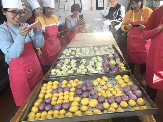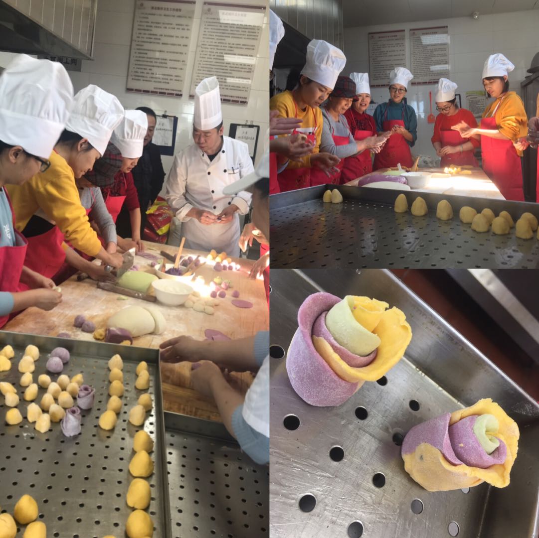 在学院食堂一楼操作间里,教职工们穿上崭新的围裙,戴上厨师帽,先由面点师傅向大家介绍花样面点的基本制作方法,之后大家开始揉面、擀面、包馅、造型等,一切都有条不紊。大家互帮互助,充分发挥想象力和创造力,气氛浓厚。1个小时之后,各式各样的创意面点出炉了,看到亲手制作的面点展现在面前,大家脸上带着一种满足感和成就感,品尝着自己动手制作的面点,纷纷夸赞又漂亮又好吃,每个人的脸上都洋溢着笑容。