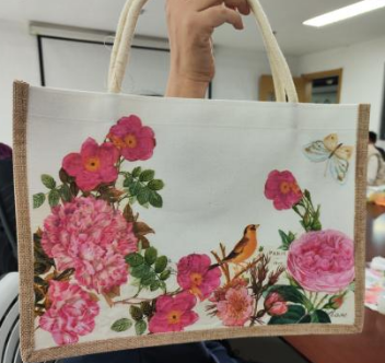 活动现场,大家首先熟悉了制作材料及手工包基本制作过程。“蝶骨巴特”(Decoupage)源自于法文,意思是将美丽图型剪裁,拼贴装饰于家饰物品或家具上,展现出创意设计的装饰艺术。随后,老师们精心挑选出各自喜欢的花卉、风景图案的专用纸巾,通过剪裁、拼贴、上胶、风干等工序,将个人灵感与巧思融入帆布包纹样之中,打造出独具特色的帆布手袋。