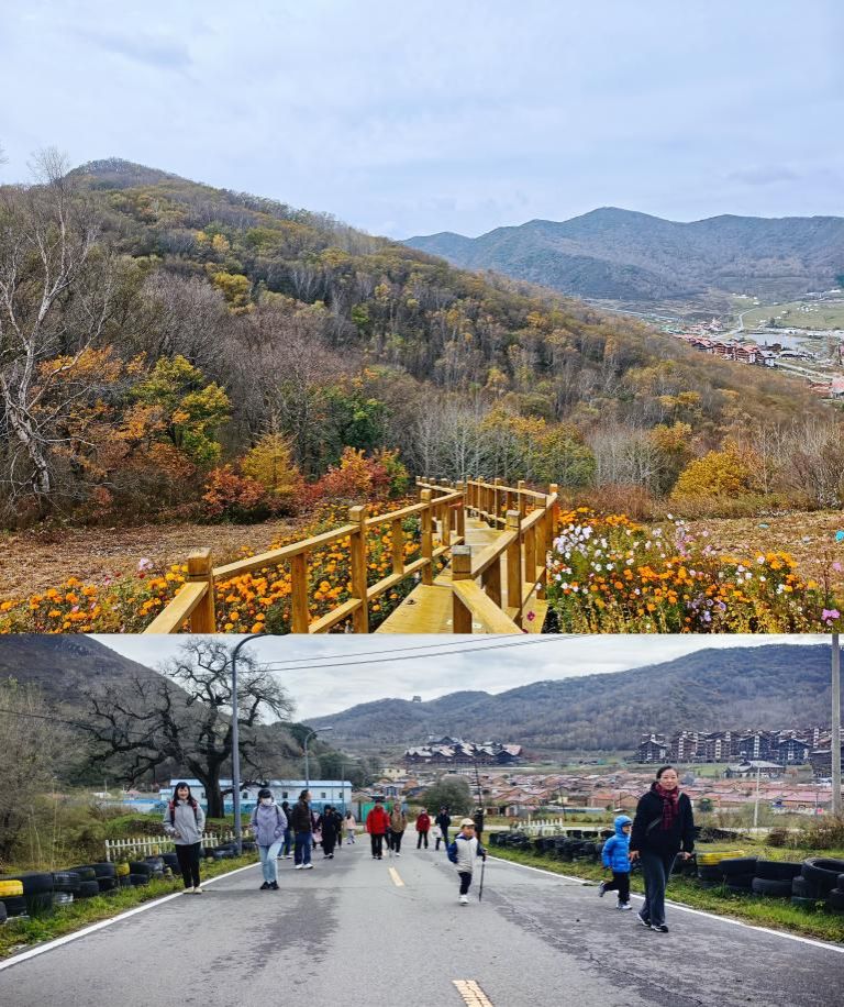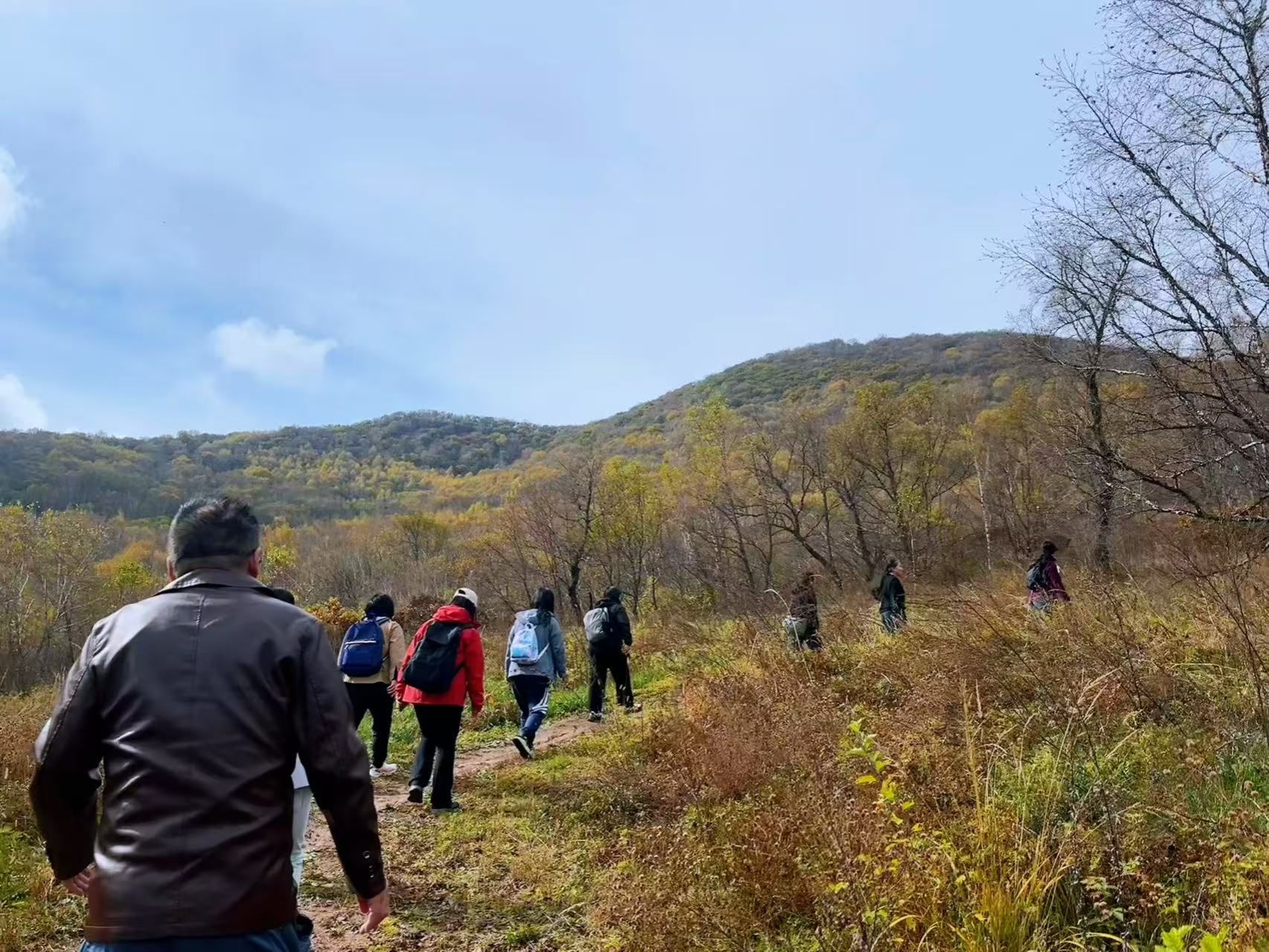 抵达山脚时,清晨的微凉仍萦绕林间,但当大家看到远处层林尽染的山峦,瞬间被自然的生机感染。沿着徒步步道前行,阳光渐渐穿透云层,将白桦林的枝叶染成金褐色,微风拂过,树叶簌簌作响,像是在欢迎远道而来的访客。路面还残留着前几天下雨的痕迹,部分道路带着些许泥泞,尤其走到一处陡坡时,脚踩上去难免发滑。“大家慢着点!踩实了再走!”走在队伍前的“第一个吃螃蟹的老师”最先察觉滑意回头喊道。有人带着小冒险精神,试着找好重心稳步快速下坡;有人则格外小心,沿着路边的草地慢行;已顺利“闯过”下坡段的老师还不忘回头,向身后的同伴传授经验:“靠山体这边走,土更实!”