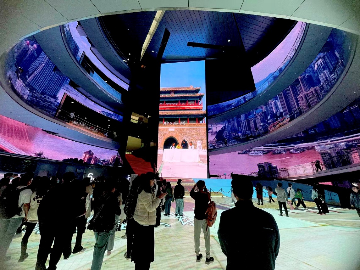 进入场馆一层中空大厅,映入眼帘的轴卷式巨幕匹配立体环绕音效,瞬间将大家带入光影世界。25米的层高环绕了1800平米圆形环幕,深色主调庄严肃穆中不失艺术神秘色彩,暗诉着中国电影发展的百年历程。在这座传播电影文化和研学交流的艺术殿堂,讲解员向大家介绍了各阶段电影的发展、广大电影工作者的重要艺术成就,揭示了电影制作的奥秘、传递了不同时期的电影情怀。通过现场体验学习的方式,让大家对新中国历史与中国电影史的整体发展脉络有了更清晰的认知。