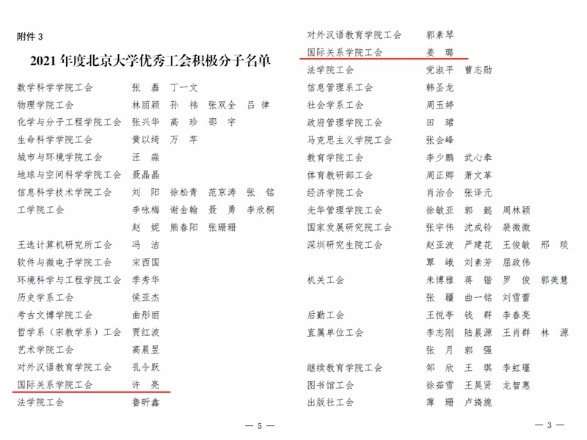 3月22日,北京大学工会网站发布了“关于表彰2021年度工会系统优秀个人的决定”,国际关系学院工会姜璐、许亮两位老师榜上有名,获得学校工会嘉誉,可喜可贺!