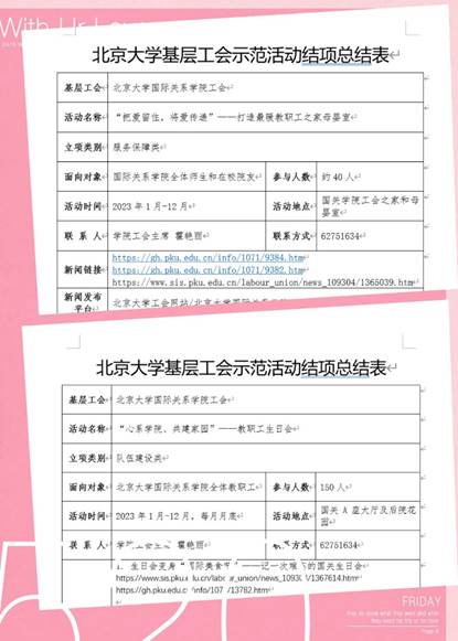 12月15日,根据北京大学工会的通知和要求,国际关系学院工会按期提交了2023年度基层工会示范活动结项报告。在工会主席霍艳丽的指导和修订下,工会宣传委员崔晓旭如期填报《北京大学基层工会示范活动结项总结表》,提交《把爱留住,将爱传递——打造最暖教职工之家母婴室》和《心系学院、共建家园——教职工生日会》的结项报告。