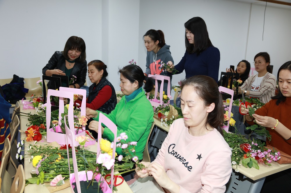 插花活动传递了美好生活理念,活动过程浪漫、温馨,加强了女教职员工之间的交流,沁人心脾的花香,色彩斑斓,使大家在感受美、欣赏美、创造美的过程中,享受着工作之余生活的美好。