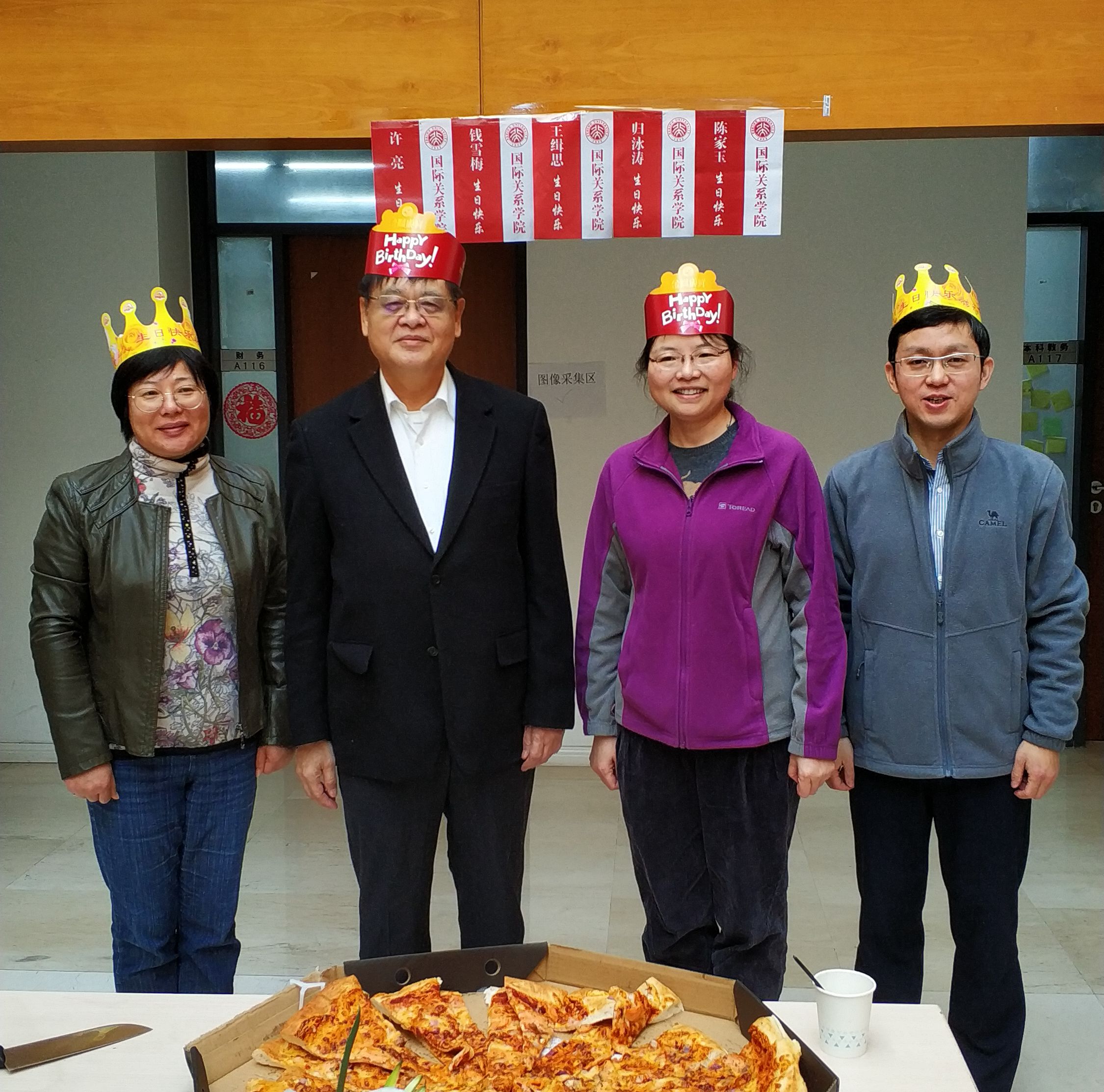 11月25日中午,国关学院十一月份“暖冬生日汇”在A座大厅如期举行。此次生日汇邀请到了众多“大咖级”老师参加,包括“学术大咖”王缉思老师、“新书大咖”钱雪梅老师、“教学名师”归泳涛老师、“财务新人”陈家玉老师等,另外,学院院长唐士其老师、退休教授代表刘金质老师、党委副书记祝诣博老师、工会主席闫岩老师、副主席霍艳丽老师等近三十名教师也纷纷赶来庆贺,真可谓是众星云集,热闹非凡。