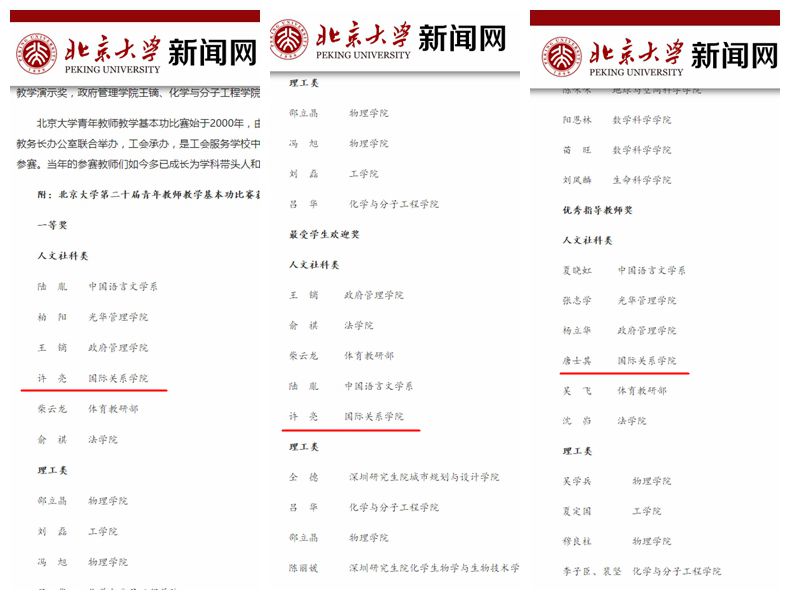 12月24日,北京大学第二十届青年教师教学基本功比赛公布获奖名单,许亮助理教授代表学院参赛并包揽人文社科类奖项,包括“人文社科类一等奖”“优秀教案奖”“最佳教学演示奖”“最受学生欢迎奖”,院长唐士其获得“优秀指导教师奖”。