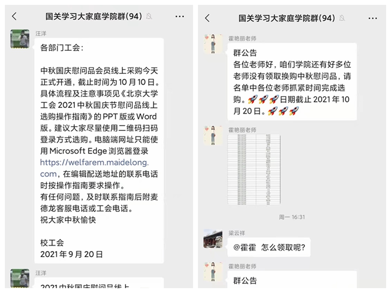中秋国庆来临之际,学校工会为全体会员送上了精美的节日慰问品。由于疫情等原因,此次慰问品的发放,还是采取线上选购送货到家的方式,需要会员通过个人用户名和账号,登录到采购页面选购。通知发布后,国际关系学院工会生活福利委员汪洋老师,就第一时间转发到学院微信群中,并针对部分离退休工会会员,进行了单独的指导和帮助。
