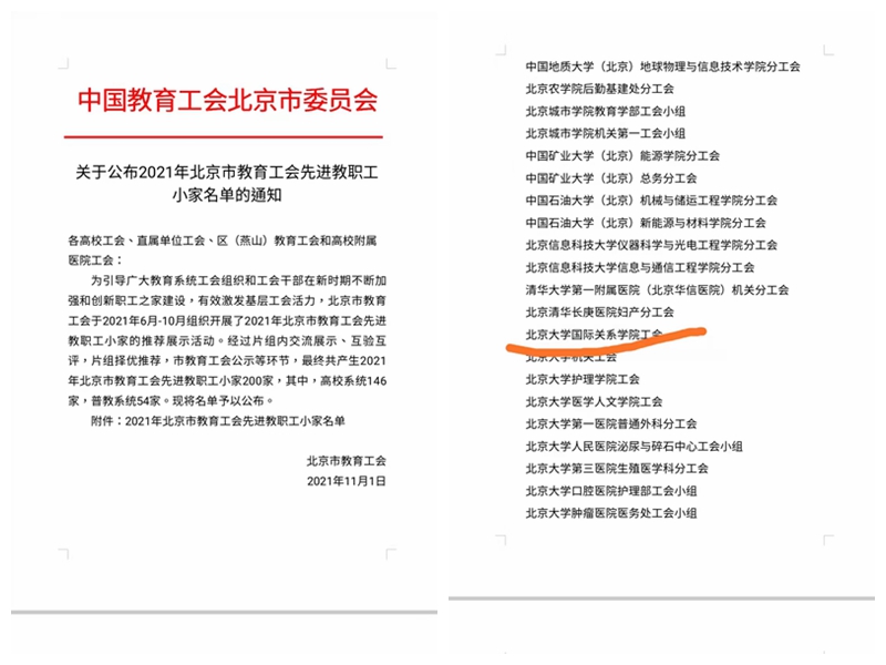 11月1日,中国教育工会北京市委员会发布通知,公布了“2021年北京市教育工会先进教职工小家名单”,北京大学国际关系学院工会名列其中,为高校系统146家之一。这次评比共评选出先进教职工小家200个,其中高校系统146家,含北京大学学院机关4家、附属医院系统6家,普教系统54家。