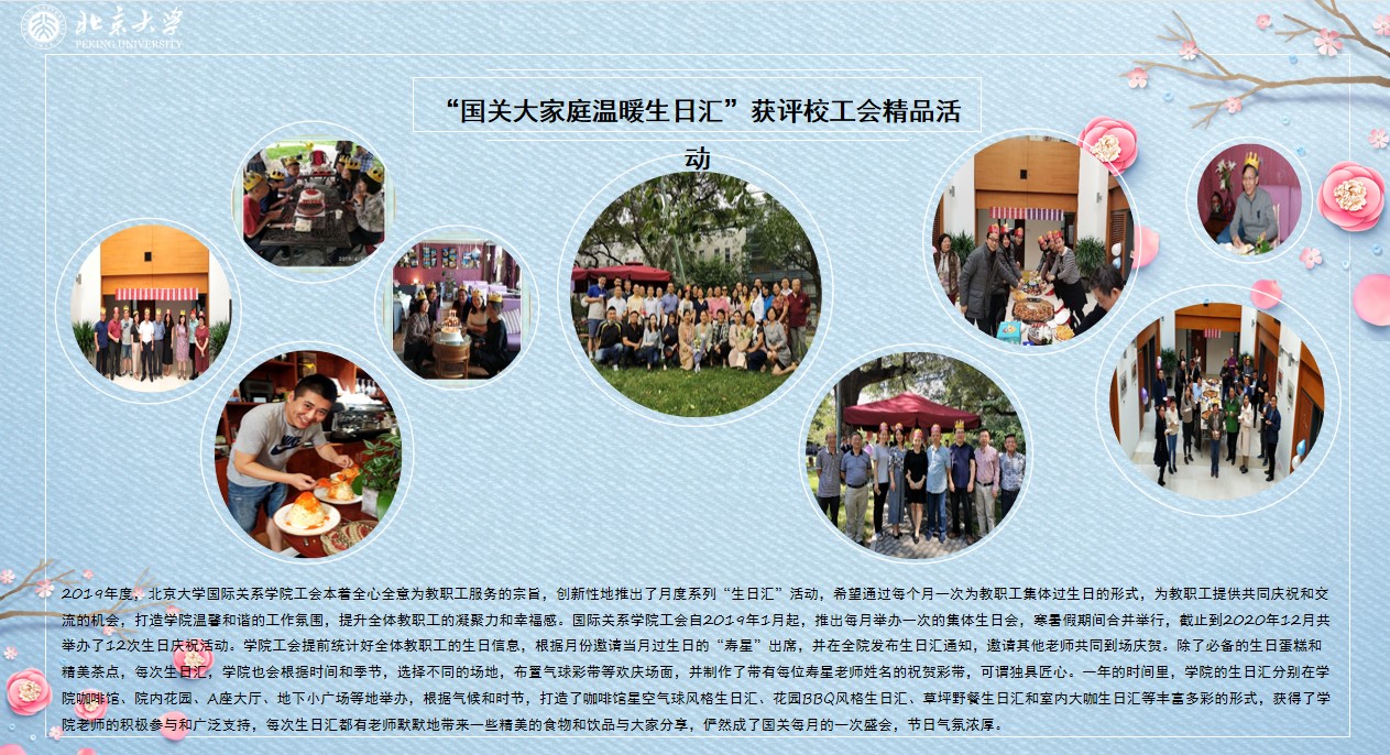 2021年4月29日,北京大学召开隆重的表彰大会,表彰2019、2020年工会活动的先进集体和优秀个人,国际关系学院工会因出色的工会工作获得了多项荣誉。除学院工会被评为“北京大学模范工会委员会”外,汪洋被评为“北京大学优秀工会干部”、杨莉被评为“北京大学优秀工会积极分子”。