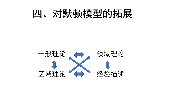 第二部分,谢老师介绍了以默顿模型为工具区分出社会学理论的不同类型,主要是中层理论和一般理论。第三部分和第四部分,谢老师引入周飞舟老师以“一本”与“一体”为基础的中国社会理论,这一理论强调与西方社会相比,“家”构成了中国社会的基础或者根本。与这一理论相比较,谢老师介绍了郑杭生老师关于“社会互构论”的理论建构。这一理论尝试通过对个人与社会之间一种“互构共变”的关系来理解和诠释现代社会的各种现象。两位学者的理论相同之处在于都将自己的理论称为“社会理论”甚至“中国社会(学)理论”。相异之处则在于,周飞舟老师试图用“一本”与“一体”为之提供基础的“中国社会理论”,主要以“中国社会”为研究对象,主要适用来描述和解释“中国社会”;郑杭生和杨敏教授所阐述的“中国(特色)社会学理论”,则以一般社会为对象,适用于描述和解释包括中国社会在内的所有社会。由此,谢老师由这两位老师的理论建构如何归属于默顿模型这一问题出发,在模型结构成分上和结构成分之间的关系上都对默顿模型进行了拓展——将中层理论划分为领域理论和区域理论,又将原来经验描述-中层理论-一般理论之间的链式结构转换成为四成分间交互作用结构。