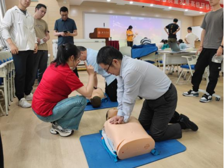 培训现场,在讲师的悉心指导下,师生们利用专业模拟假人,分组进行了“单人心肺复苏”和“双人心肺复苏结合AED使用”的实操演练。通过模拟真实的急救场景,深入学习了如何准确判断患者状况、规范进行心肺复苏,以及AED的正确使用方式。培训中,讲师还特别强调了快速获取AED的重要性,并向师生们介绍了如何通过“北京120”等微信小程序查询周边AED的具体位置,为在紧急情况下争取宝贵的救援时间提供了实用指引。