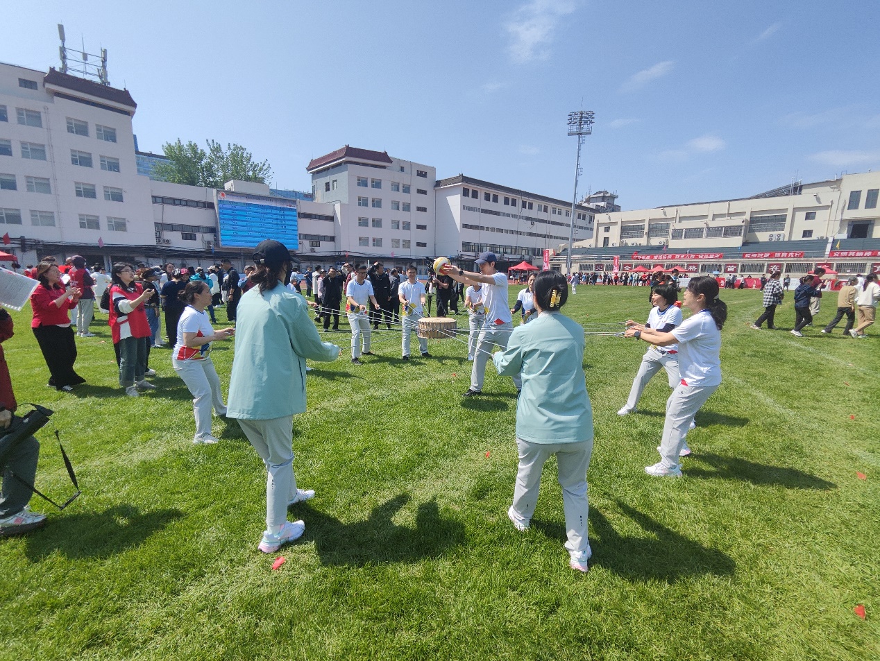 4月20日,北京大学五四操场的东南角爆发一阵喝彩欢呼。观众们围成一圈,为新闻与传播学院的教工参赛队加油。在圆圈中心,是还在继续创造纪录的队员们。他们继续奋力拉住手中的绳索,专注于眼前正在鼓面上有节奏跳动的球,对周遭的一切已难以分心顾及。