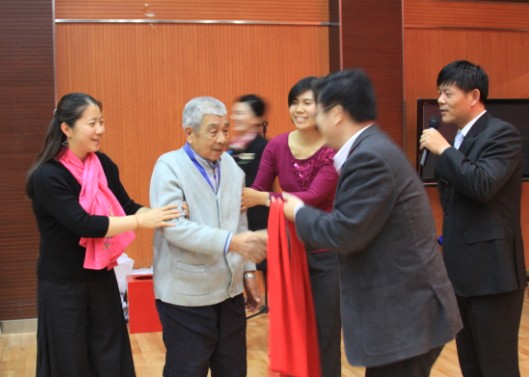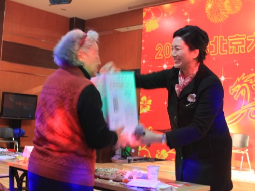 晚会还特别为将在几天后过生日的张亚谦、王东敏、张冰老师送来了深深的祝福。三位主任分别为他们送上生日礼物,在场人员为他们共唱生日歌。在每两个节目之间,晚会都设计了抽奖的环节,许多教师都抱得大奖归。非常幸运获得一等奖的张锐书记,将礼物转赠给了德高望重90岁高龄的喜勋老先生,并表达了深深的祝福。