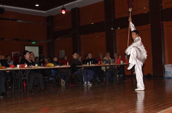 晚会由体育部教师吴昊和10级研究生张景瑜主持。杜军明首先登台献艺,为大家带来了武术大刀表演。随后郑化江老师一曲《母亲》将大家带入了对母亲的深深思念当中。11级研究生冯雪晗的伦巴表演,惊艳四座。名为“冲锋陷阵”的游戏将我们的四位领导着实“折腾”了一把。退休教师骆正展示了双手书法,由全体研究生带来的情景剧《我要你的唉》,让所有人都记住了张雨扮演的女一号。首次参加体育部晚会的邱德拔体育馆工作人员也带来了自己的舞蹈《梁祝》。曾为师兄弟的邢衍安老师、张雨同学带来的《春节大酬宾》逗得全场观众捧腹大笑。而由健美操队宋璐璐和王帅带来《旅行的意义》让人倍感清新。最后,由青年教师组成的红歌合唱队的一曲红歌串烧,在《歌唱祖国》的高昂乐曲声中,将晚会推向了高潮。