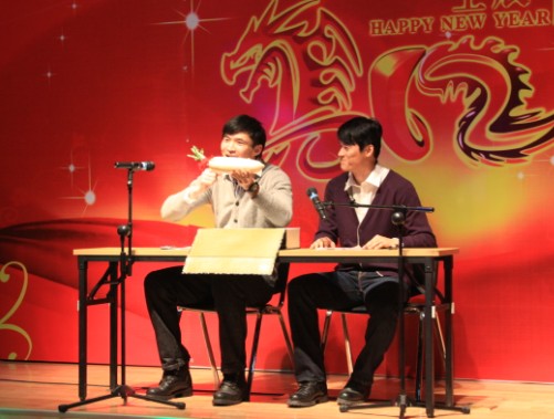 新年晚会在一个名为“大体育”的游戏中开场,在场师生不分彼此,完全投入到游戏中来,年迈的长者,朝气蓬勃的研究生都笑成一片,年终大戏在一片欢声笑语中开场!
