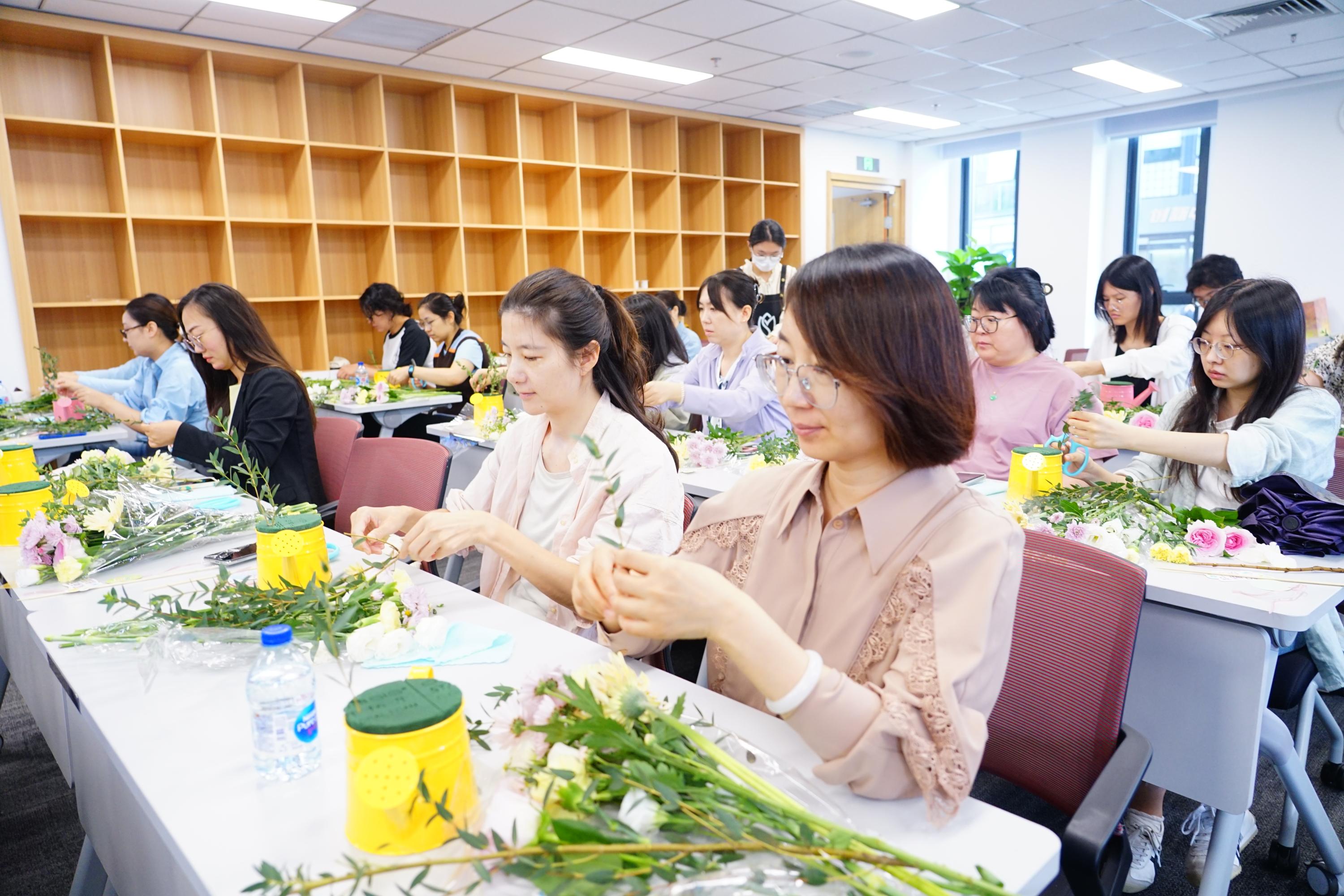 活动现场专业花艺师为大家介绍了插花的基本技巧和注意事项,让大家对插花艺术有了初步的了解。在花艺师的指导下,教职工们纷纷动手,用心挑选花朵,精心设计造型。大家互相交流,分享心得,整个过程充满了欢声笑语。每一束花都凝聚了大家的心血和创意,展现了她们对美的追求和对生活的热爱。