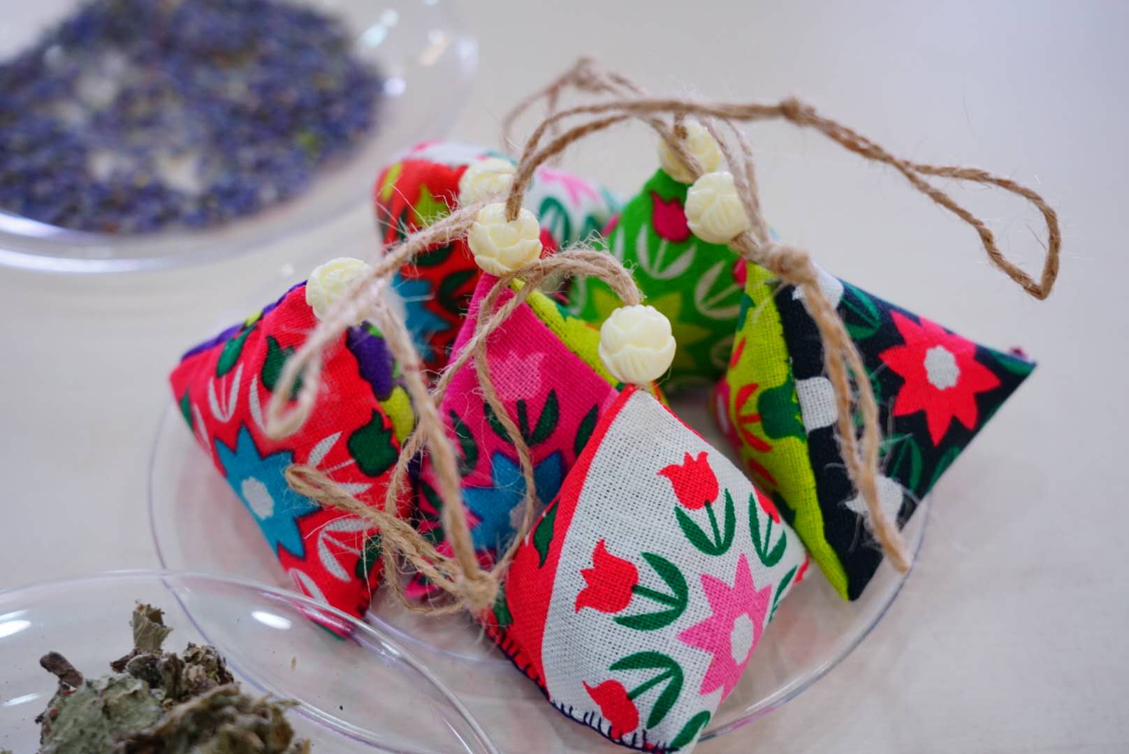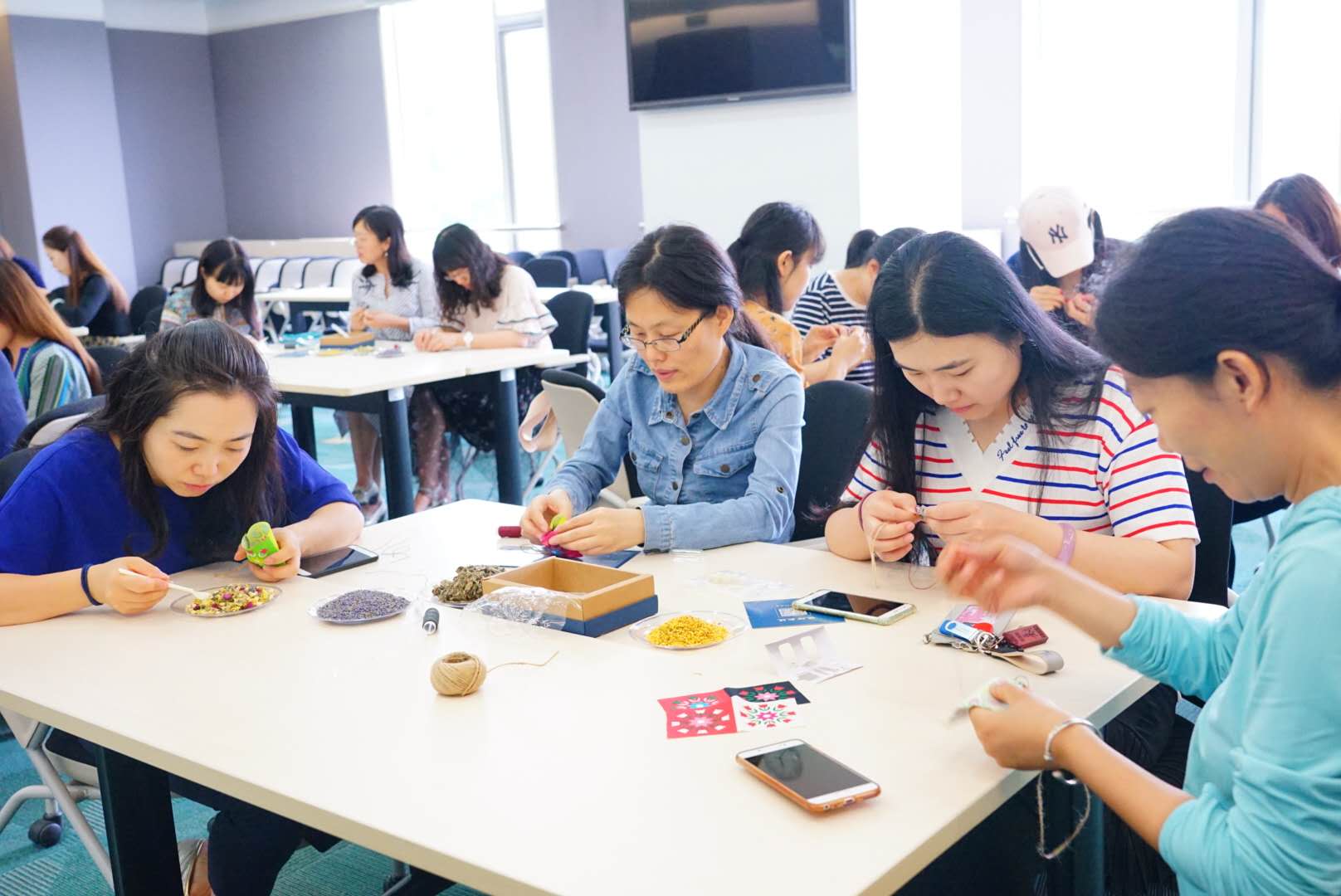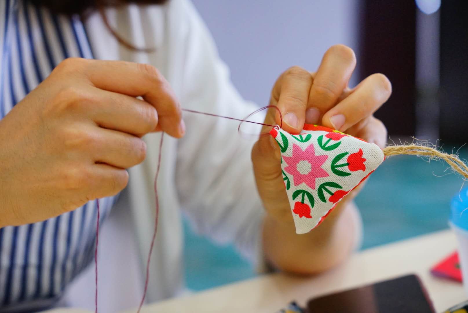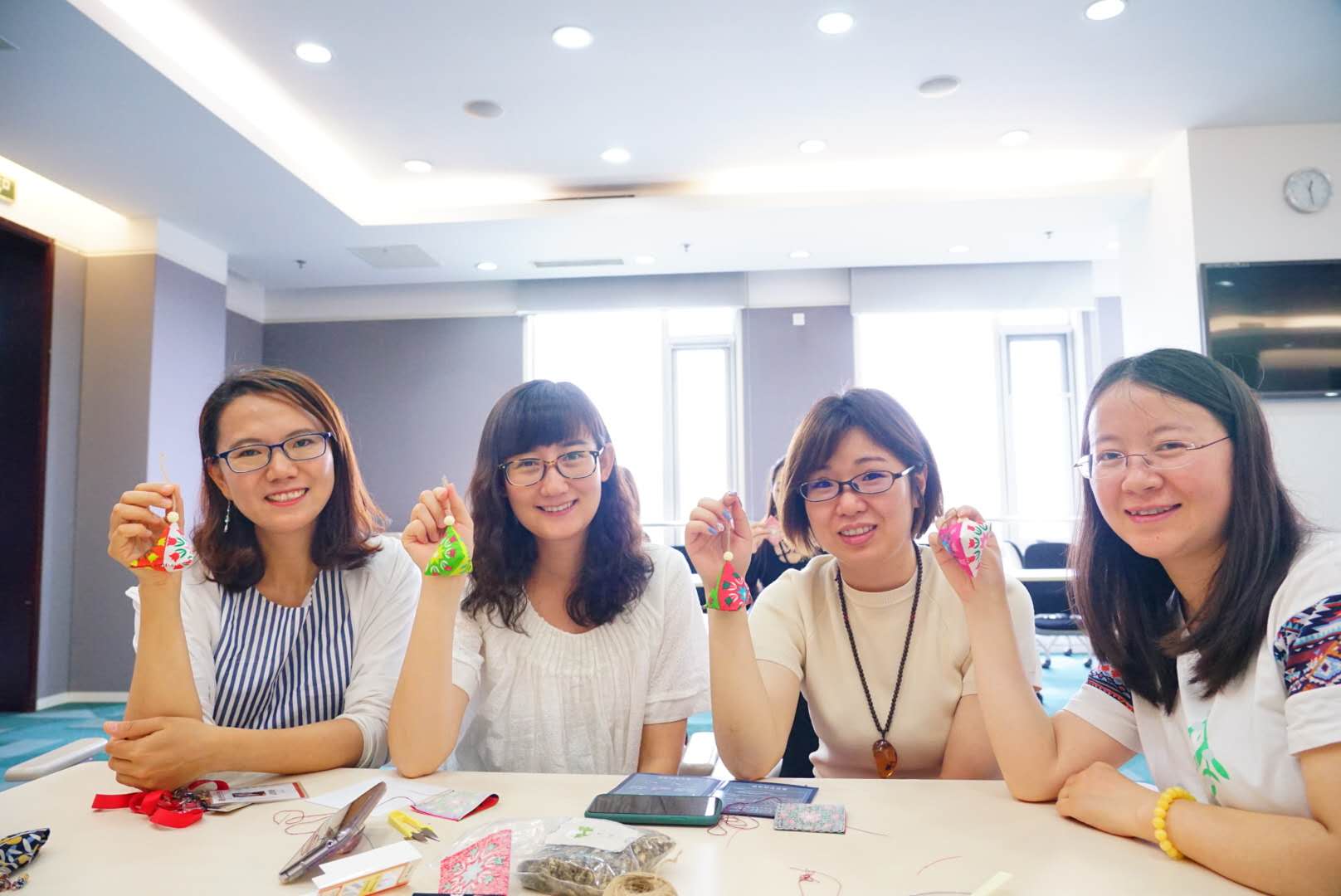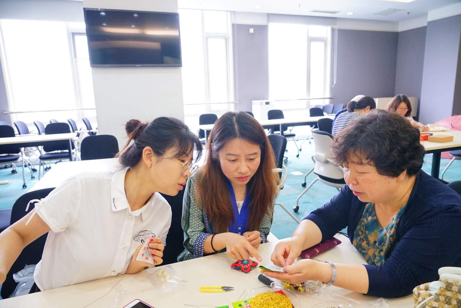 活动的内容是制作香囊和编制手链。参加活动的老师们各个心灵手巧,小块的布料、散乱的香料,通过老师们认真的缝制,很快就变成了可爱的小香囊;五色的彩绳被老师们的巧妙编制,也变成漂亮的手链。