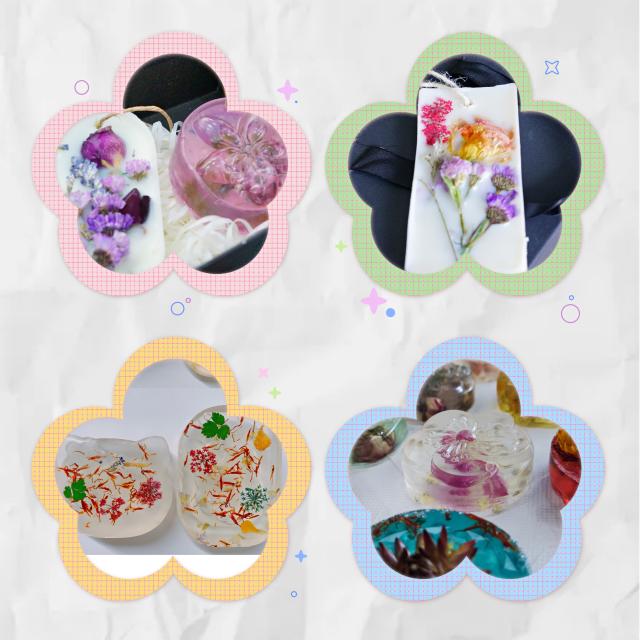这次的压花体验课主要是利用压制好的干花制作香薰蜡片和手工香皂。为了节省时间,首先,将大豆蜡和皂基包用容器和速热包加热至液化状态,然后分别倒入量杯中。做香薰蜡片,需要在量杯中加精油,搅拌均匀后,倒入模具中,待稍微冷却后,将花材放在最上层;做手工皂:需要添加喜欢的色素,精油或者药粉,搅拌均匀后,倒入模具中,根据自己放置花材的需要,可分层倾注皂液。剩下的就是静静的等待,等磨具中的液体完全冷却定型后,进行脱模,完整的香片和手工皂就制作完成。