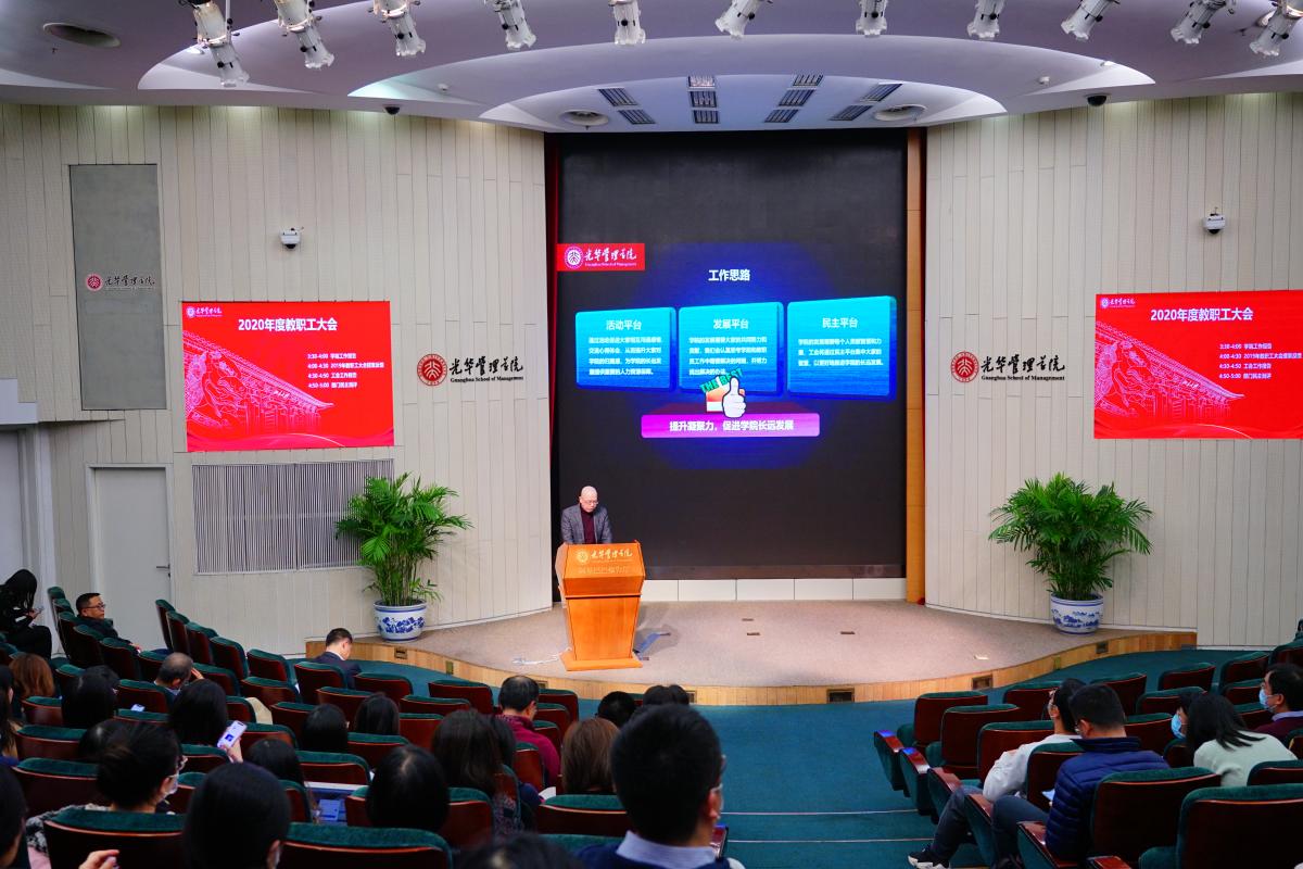 凝心聚力,共谋发展;砥砺奋进,再谱华章,12月23日下午3点,光华管理学院2020年度教教职工大会在光华2号楼102报告厅举行,大会由工会主席吴联生主持,学院领导班子成员及全体教职员260余人参加了会议。
