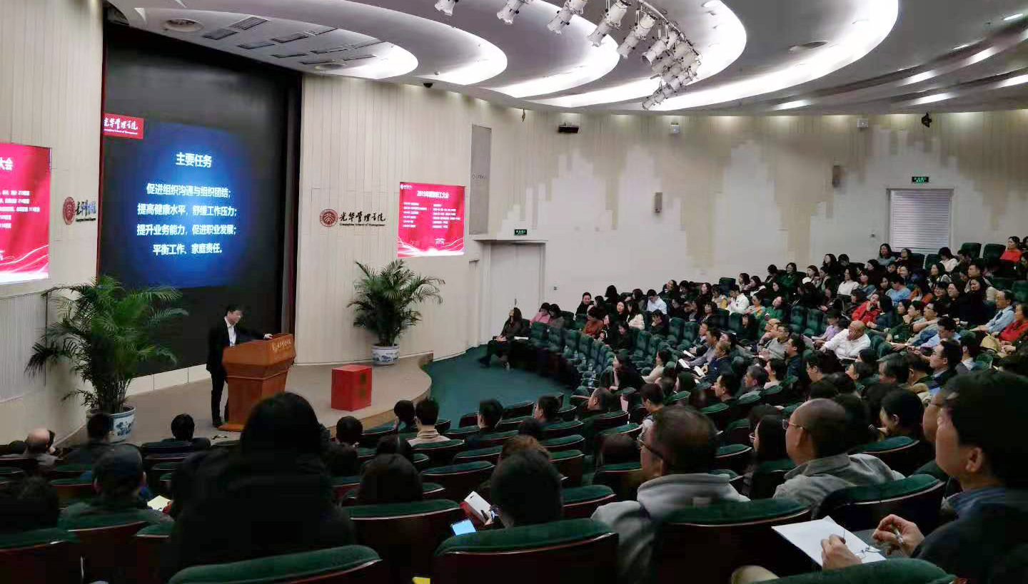 2019年12月25日下午,在光华2号楼阿里巴巴报告厅召开了2019年度光华管理学院教职工大会。大会分三项内容,工作总结、民主测评和分组讨论。刘俏院长的工作报告,从学院的总体情况、教学科研、学科发展、人才培养、服务社会、未来发展等方面做了总结和展望;马化祥书记对2018年教职工大会提案的办理情况逐一做了回复和解答;张闫龙副主席对工会一年来的活动组织形式、创新项目和参与效果做了详细的汇报。随后与会人员对学院教学机构和管理服务机构进行了民主测评并进行了以“学院未来发展”为主题的分组讨论。