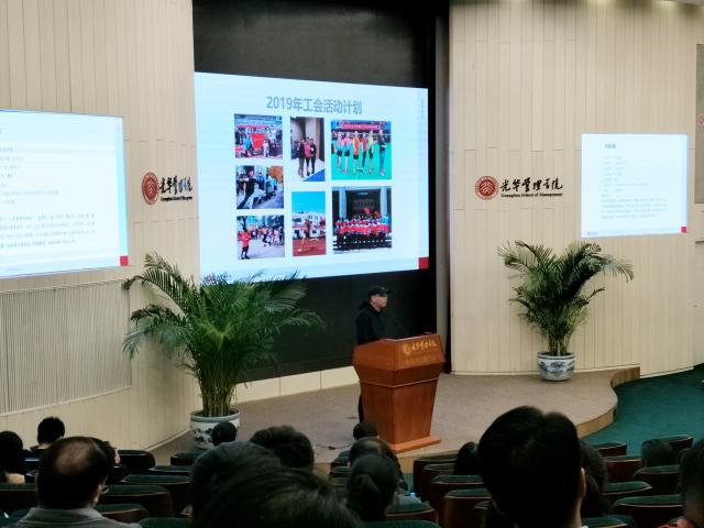 光华管理学院2018年度教职工大会于2018年12月26日下午,在光华新楼阿里巴巴报告厅举行。参加会议的有教职员245人,会议由工会副主席张闫龙教授主持。