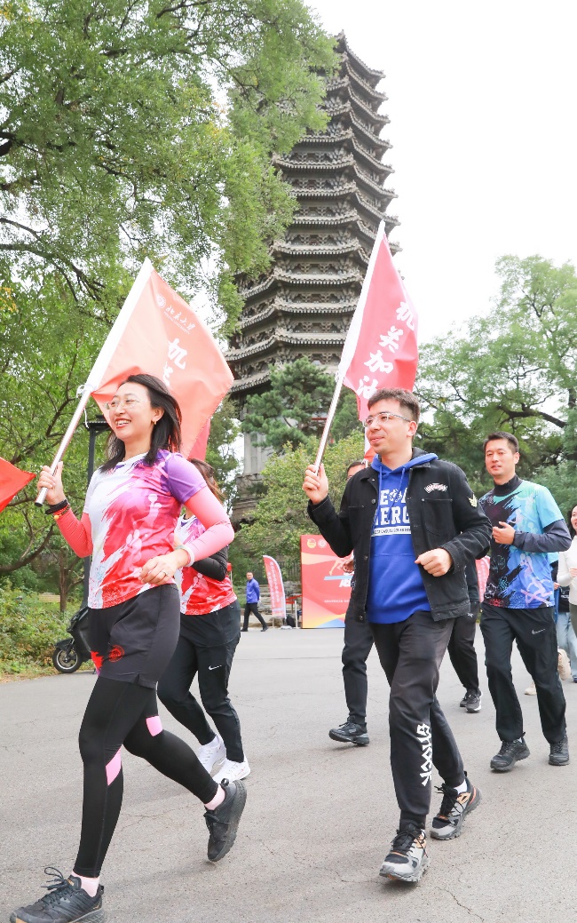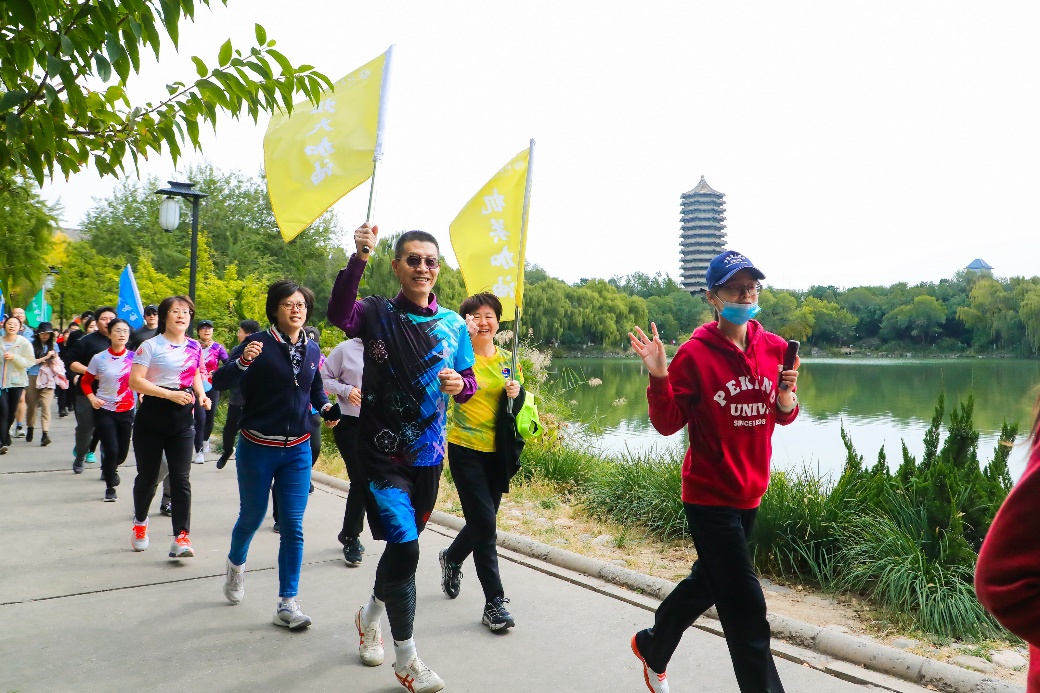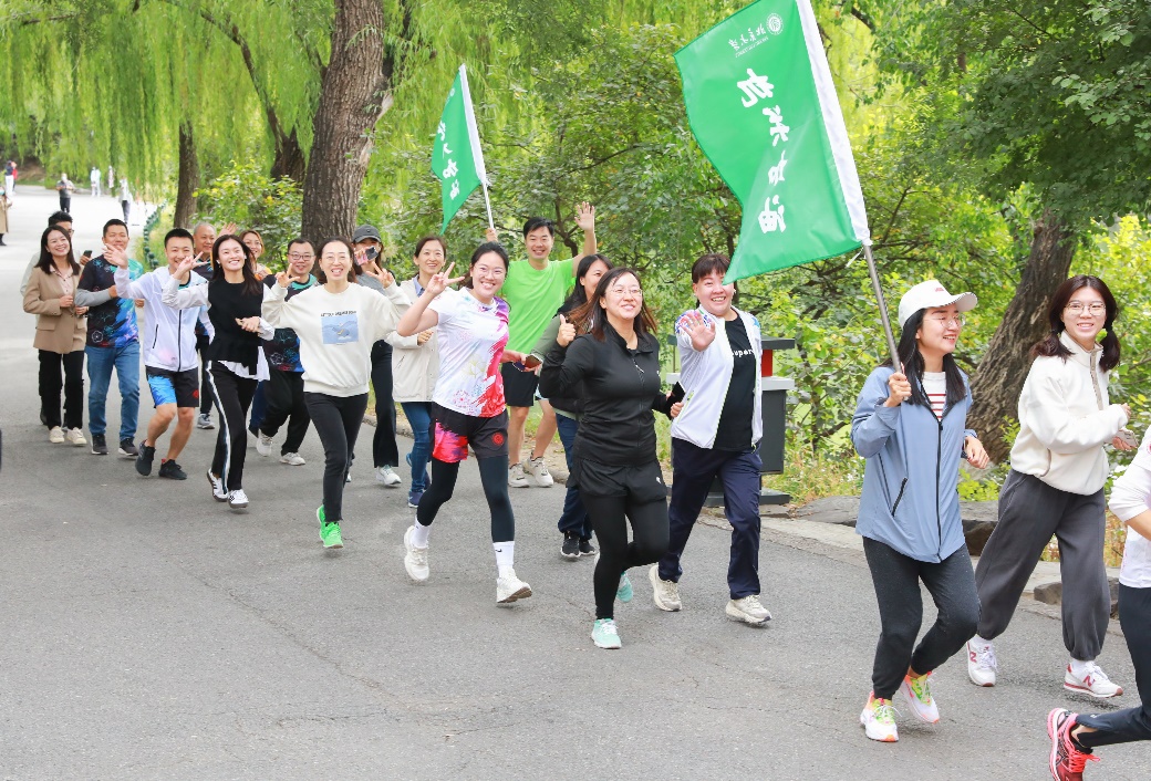 机关党委书记刘旭东鸣响起跑发令枪。在龚旗煌、顾涛的带领下,各组组员整齐地排成两列,在两面组旗的引领下分别从博雅塔下出发,环绕未名湖奔跑两圈。老师们意气风发,不时齐声高喊“团结起来,振兴中华”,正如道旗上所写“在强国之路上奋力奔跑,在复兴伟业中挺立潮头”。跑完全程后,龚旗煌、顾涛与全体参与教职工合影留念。