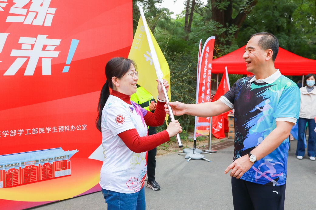5日中午,如约而至的机关教职工统一着装、精神饱满,在博雅塔下签到集合。审计室主任周有光,校工会常务副主席张宝岭,以及机关工会、宣传部的老师们主动承担起摄像摄影、分发物品、看护服装等志愿服务工作。大家在机关工会文体委员彭湘兰的带领下集体热身,然后分为四组,由龚旗煌和顾涛分别向每个小组的组长、副组长授旗,红、黄、蓝、绿四色旗帜上面分别写着“北大加油”“机关加油”字样。