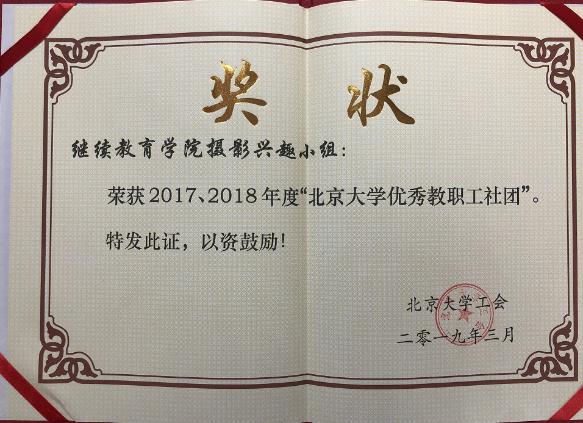 日前,北京大学工会2019年表彰会顺利举办,会议公布了“北京大学优秀教职工社团”评选结果,我院摄影兴趣小组在众多参评单位中脱颖而出,荣获2017、2018年度“北京大学优秀教职工社团”称号。