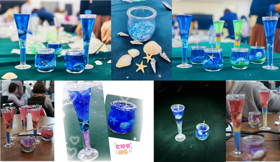 香气清幽的现场,工作人员依次为大家分发了早已准备好的蜡烛制作原材料和贝壳海星等辅材,并为大家介绍了香薰蜡烛的制作流程和注意事项。融蜡、滴精油、倒沙、贴贝、定形、埋芯……一系列的海洋风情被装进了玻璃杯中。在等待蜡烛凝固成型的过程中,大家交流着制作心得,欣赏着彼此的作品,在慢下来的时光里,滋养自己,润泽他人。经过了近一个小时DIY,烈红色的、魅蓝色的、青绿色的、淡黄色的、浅紫色的……各色各样的香薰蜡烛映入眼帘,原先零散的贝壳海螺,逐渐被赋予灵魂。