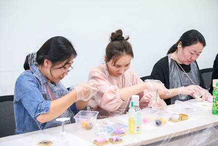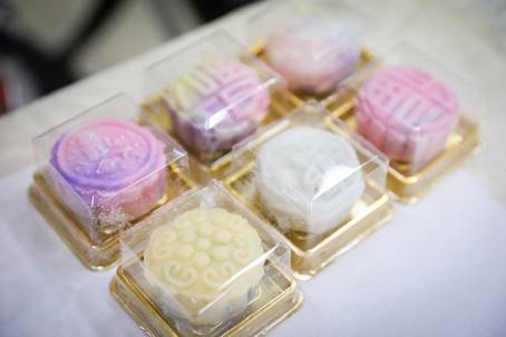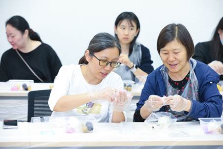 五颜六色的面团、质地诱人的馅儿料、线条精致的组合模具……在活动现场,工作人员早早将制作月饼的原料和工具整齐摆放到桌面。机关老师们围在坐一起,系好围裙、戴上手套,跃跃欲试。在工作人员详细讲解月饼的制作方法和注意事项后,机关老师们便开始一展身手,揉面团、包馅料、压饼模……机关老师们忙得不亦乐乎,将温馨祝福与美好心愿“揉”进小小月饼中。从用单色饼皮包馅儿,到尝试制作双色相间、三色混合、多色渐变月饼,机关老师们不断挑战制作难度,一块块晶莹剔透、色彩绚丽、雕花精致的冰皮月饼不多会儿就已“新鲜出炉”——有的质感温润如玉,有的色彩质朴厚重,还有的如水墨画般灵动……姿态各异的风格、精雕细琢的图案,宛如琳琅满目的艺术品。