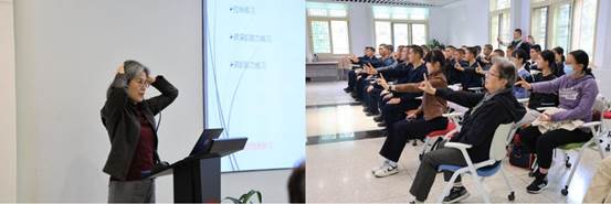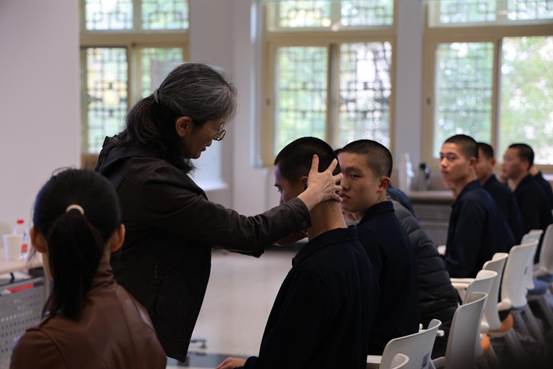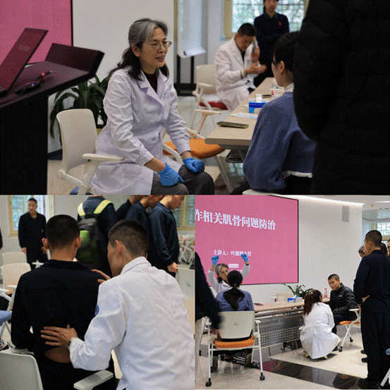 随后,叶超群主任介绍了相应的预防措施,如合理膳食、避免长时间固定姿势、提高体能、加强防护。其中,她重点介绍了预防颈部和腰部伤病的具体方法。叶超群医生现场演示并教授了师生们多种练习方法,大家也认真地学习并掌握了动作要领。