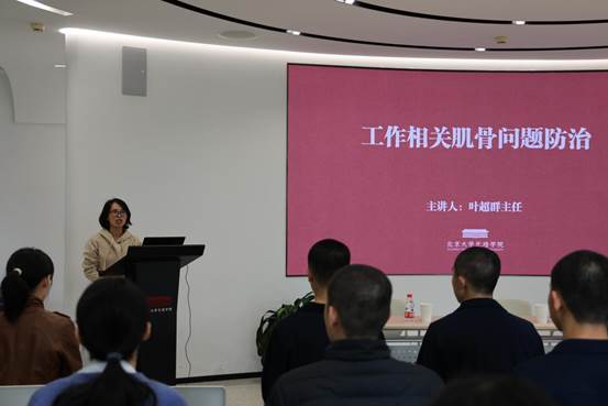 叶超群主任随后从多个维度出发,包括工作相关肌肉骨骼问题(WMSD)的基础概念、风险因素、日常预防措施以及针对颈部和腰部伤害的特定防护策略等,为在场师生提供了一次内容丰富的科普讲解。