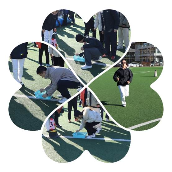 最后的项目是激情旋风,这是体能与速度的较量,是智慧与协作的比拼。六位老师排成一横队,用双手共同扶住一根中粗长竹竿,绕标志筒进行S形变向跑。一开局,元培学院的队伍便遥遥领先,绕过一个柱子、两个柱子,以半圈的优势把对手甩在身后。最终,元培学院的老师们凭借优秀的奔跑实力和团结的默契配合,取得了小组第一名的好成绩!