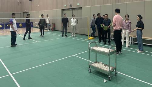 活动外请学校羽毛球队队员指导职工羽毛球技术,大家在教练的指导下认真学习、反复练习。