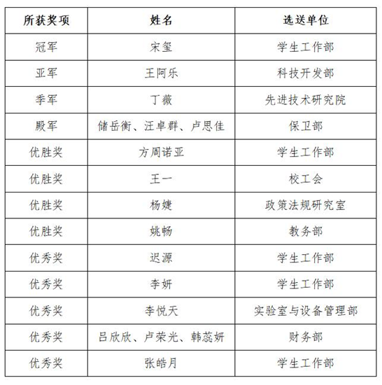 机关各部门选派的歌手在激烈的角逐过程中,都展现出了各自的才华与魅力。最终,学生工作部宋玺获得冠军,科技开发部王阿乐获得亚军,先进技术研究院丁薇获得季军,保卫部储岳衡、汪卓群、卢思佳获得殿军。杨婕等4人荣获优胜奖,李悦天等6人荣获优秀奖。他们的精彩表现赢得了现场观众的热烈掌声,在场的评委和嘉宾逐一向获奖的各位选手颁奖祝贺。