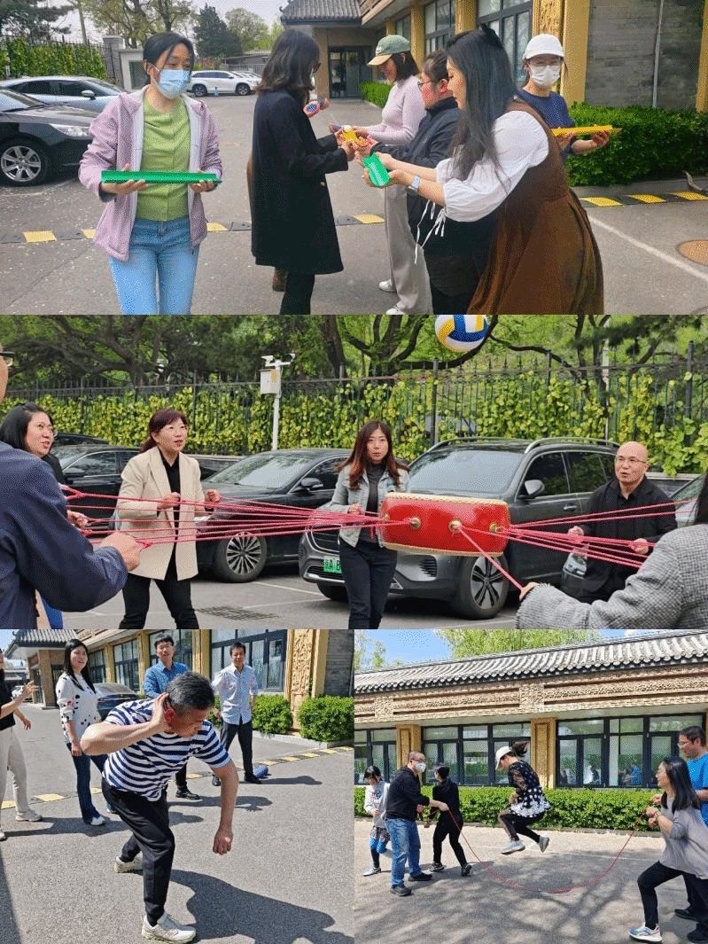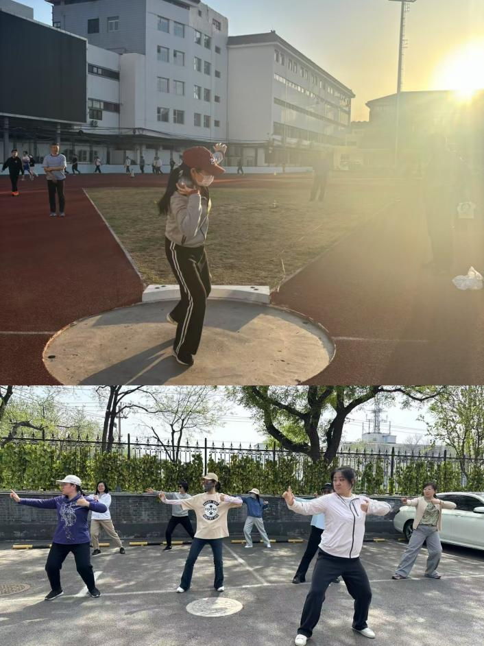团体操八段锦小队的老师们动作规范整齐,将中国传统健身功法中刚劲与神韵展现得淋漓尽致。练习珠行千里项目的老师们全神贯注,他们手持道具,小心翼翼地传递着小球,“快,稳住!”“好,衔接上了!”训练场上,不时传来老师们相互提醒和鼓励的声音。同心鼓项目更是热闹非凡。老师们紧紧拉住连接鼓的绳子,目光紧紧盯着空中的排球。“一、二、三,开始!”每一次成功的颠球都伴随着老师们的欢呼,而偶尔的失误也没有打击大家的积极性,老师们边练习边总结经验、改进方法,连续颠球的次数越来越多,配合越来越默契。旋风跑的老师们组成小队,在奔跑中不断调整速度与方向,尝试着如何才能又快又不让每一个掉队。跳绳小队中,摇绳的老师节奏稳定,跳绳的老师轻盈跳跃,大家在一次次的起落中感受着运动的快乐与团队的力量。