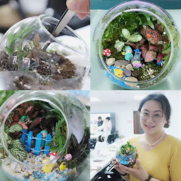 制作好的每一盆盆栽,都是一座极具个性表达的微型花园,充分彰显着大家天马行空的想象力:或简约大方,或野趣横生,或天真烂漫……方寸玻璃内,积蓄参天之力;片片青绿间,尽显师者柔情。大家纷纷与自己的盆栽作品合影留念,而这些盆栽作品,将被教职工们带往各自的办公室,成为一道道独特的风景线。