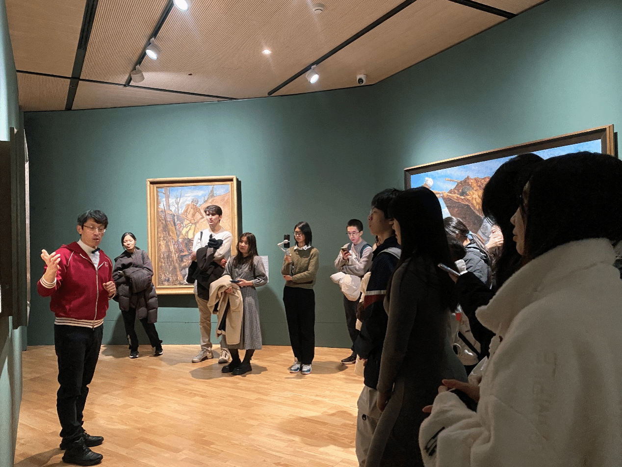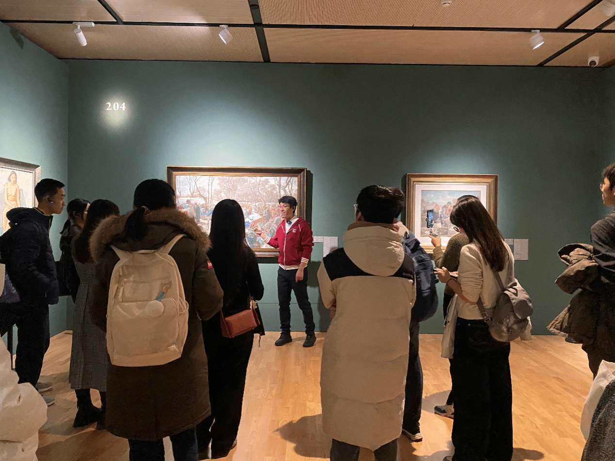 中央美术学院建校百年来,始自北平艺专的中央美术学院及所属美术馆一直持续、有序开展经典美术作品是时代的记忆,蕴含着艺术家的情感和时代基因,是我们触摸历史的视觉镜像,观众可通过展览感受不同时期的艺术追求、艺术探索以及作品呈现的时代面貌。中央美术学院多工笔水墨、造像瓷器等历史遗物的展示。师生们无不为央美广博而珍贵的馆藏所折服,纷纷围在央美金牌导览王老师周围认真倾听。自李叔同的油画始,一幅幅艺术作品掠过眼帘,齐白石、徐悲鸿、李大千、李可染、靳尚谊等名家依次登场,师生们在艺术的记载中重温中国在20世纪同21世纪初期的历史脉络与时代风貌; 画家极具中国古典美感、现代艺术写实感的作品唤醒了师生们的历史、文化记忆,不由沉浸在国风的魅力中流连忘返。