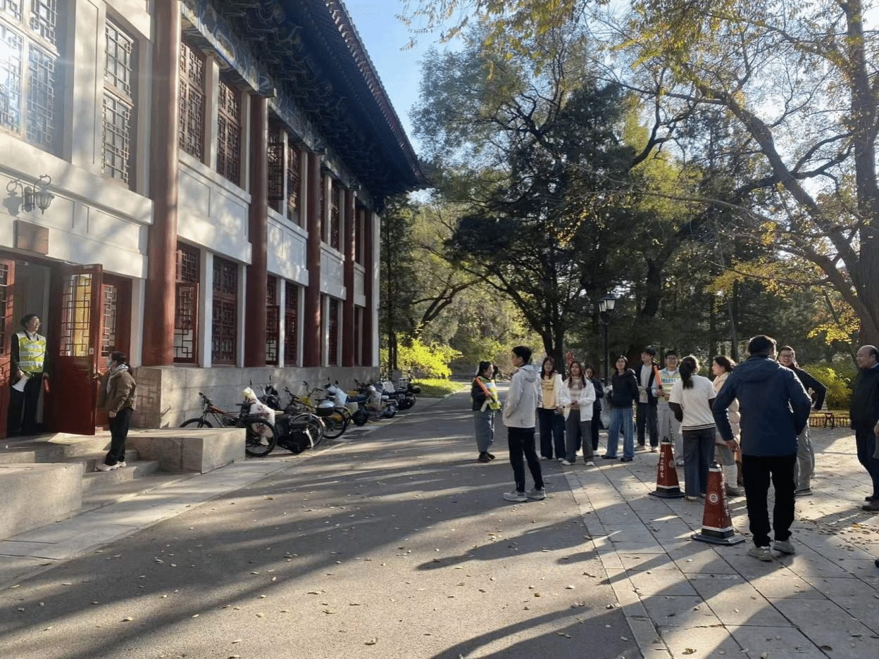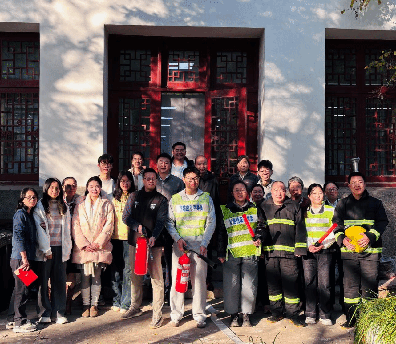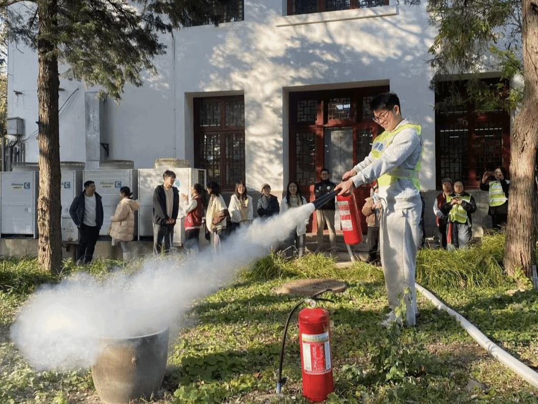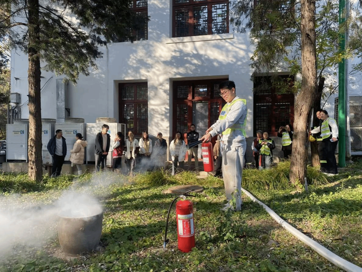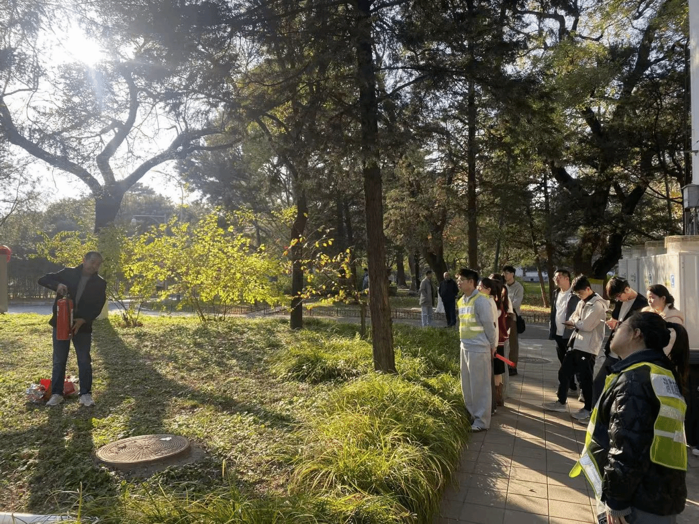2025年11月11日,元培学院工会举办秋季消防演习。下午2点30分,俄文楼内响起消防警报,在身着消防马甲、挥舞荧光棒的老师指挥下,师生们反应迅速,有序撤离,疏散至户外空旷地带集合。