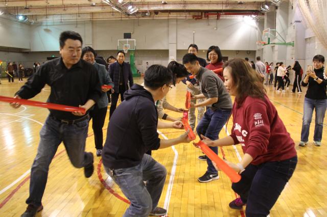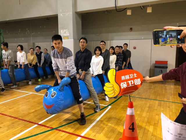 赛前,机关分工会主席袁红利老师和校工会朱博雅老师对比赛进行了简单介绍说明后,随着裁判的一声号令,比赛正式开始。第一项进行的是毛毛虫竞技,保卫部队员们排兵布阵、练习了几遍口令后迅速进入状态,随着整齐的“1、2,1、2”的口号声,保卫部队伍在小组赛中第一个冲向终点。裁判员认真地看着每一位队员的动作,时不时看下手中的秒表,比赛进行得如火如荼。第二项是珠行千里,珠行千里既需要角度的掌控,又需要力量的均匀,可谓“差之毫厘,谬之千里”。第三项是两人一组背对背夹着气球接力跑的“夹西瓜接力”,这既是速度的比拼,又是协调性的考验。第四项是“百发百中”,队员们需在规定时间内将羽毛球打入画好的方格中,根据进入的位置计分,这项比赛是今年的新项目,保卫部队员也毫不逊色,共同完成了这一新的挑战。