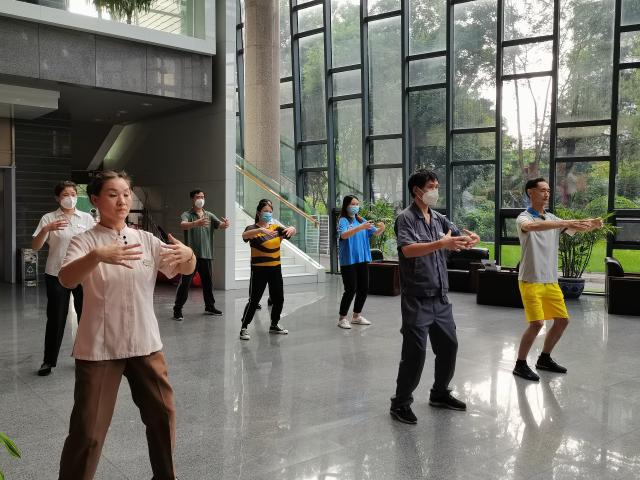 受疫情影响,太极拳兴趣小组活动不定期举行,采用线上、线下相结合的方式在中关新园尝试开课,吸引了众多员工参加。陈教练讲解了太极拳的基本知识和学习要义,随后带领大家学习无极桩和抱球桩等太极拳根基桩法。他与现场学员们充分互动,手把手为学员们纠正动作,提示要领。大家在尽情挥洒汗水、放松身心的同时,静心感受太极拳修身养性、陶冶情操的丰富内涵。