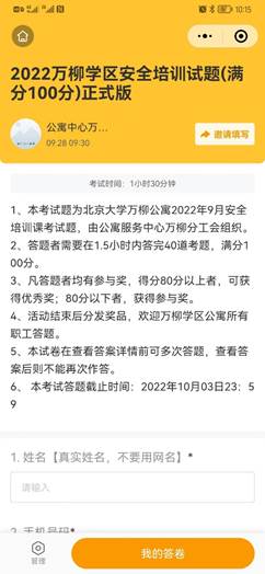 几场大风后,秋意更深。为加强职工安全生产意识,巩固安全生产知识,公寓服务中心万柳分工会于国庆期间通过微信小程序答卷的形式,对特房中心9月15日安全培训会后的学习成果进行了检验。试题重点围绕日常检维修作业与消防安全常遇问题与易忽视问题,旨在通过试卷了解大家对培训内容的掌握程度,从而督促大家继续学习提高。本次安全培训考试共有89人参加,其中有45人获得满分,27人达到90分以上,大家在此次培训中都受益匪浅,表示度过了一个有意义的国庆假期。