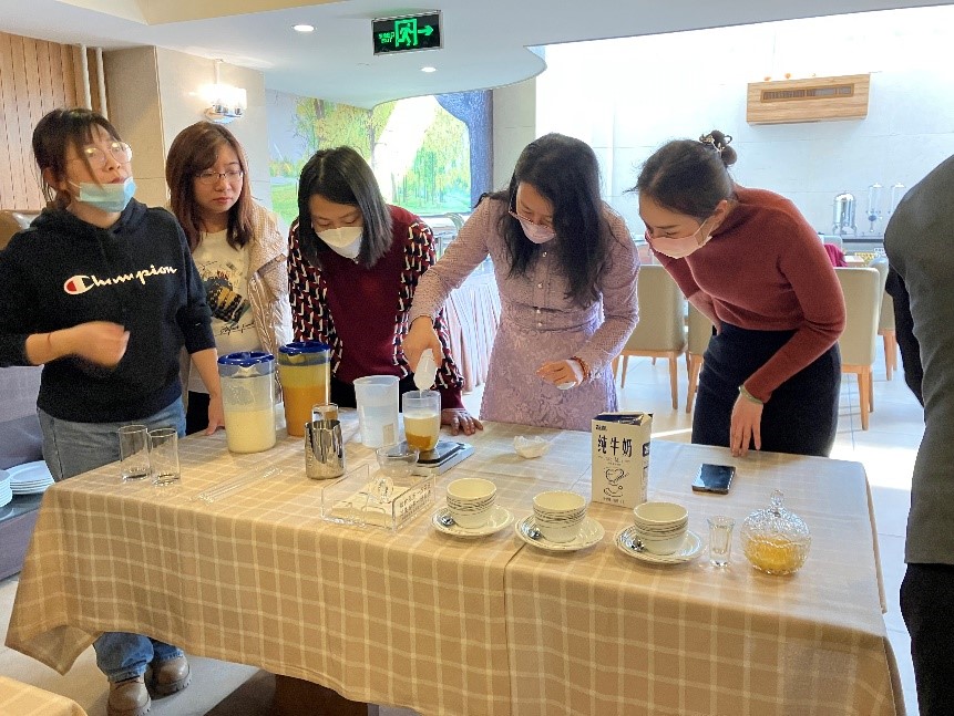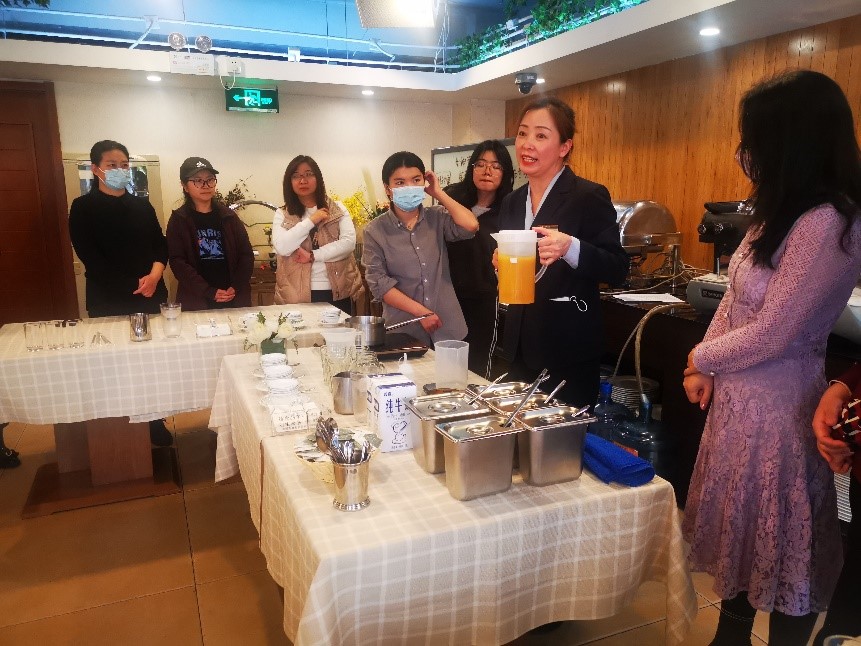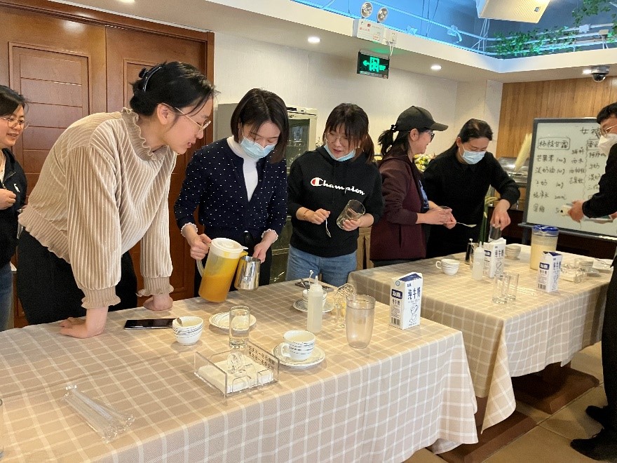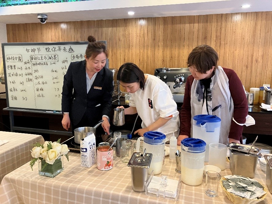 浅淡优雅的素格桌布、金黄色的芒果茸、晶莹剔透的西米露、浓浓的咖啡香气……3月8日下午,一迈进勺园西餐厅活动场地,大家就被这样的现场布置深深地吸引住了。后勤系统近30名女性党员、员工兴致勃勃地参加了活动,她们在勺园西餐厅副经理路艳丽的讲授下,制作了杨枝甘露、红豆布丁奶茶、卡布奇诺(拉花)三款饮料。