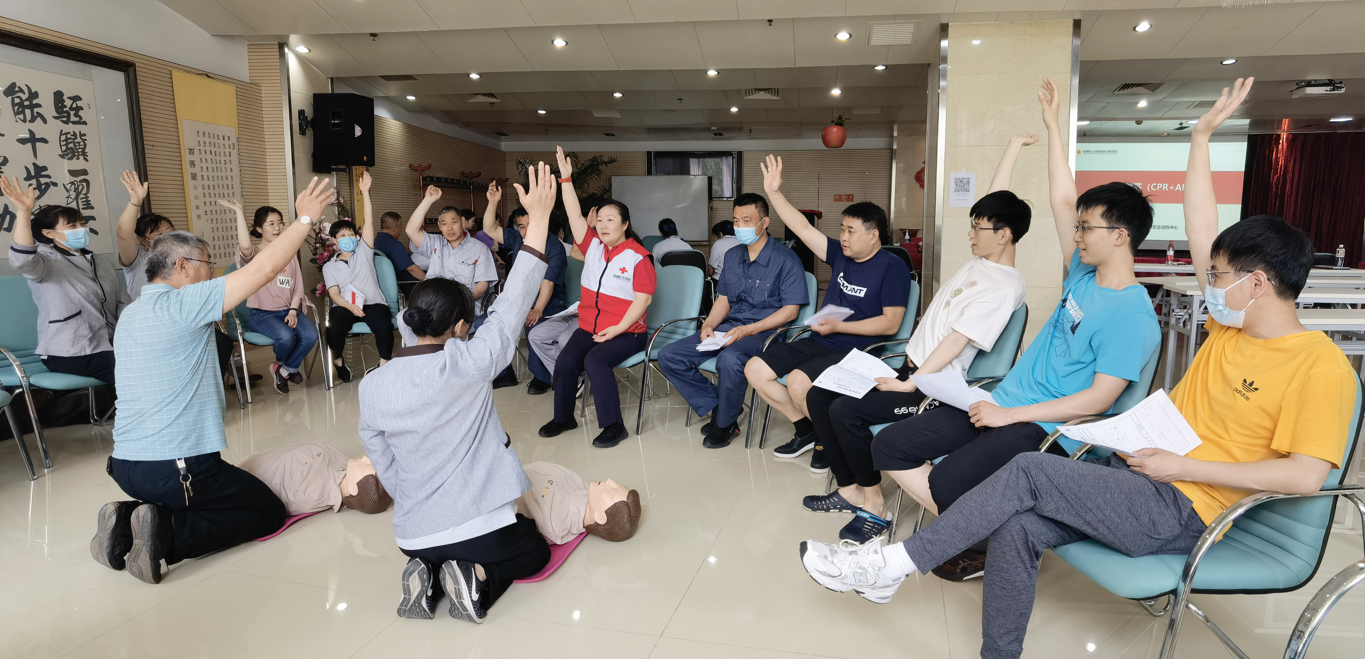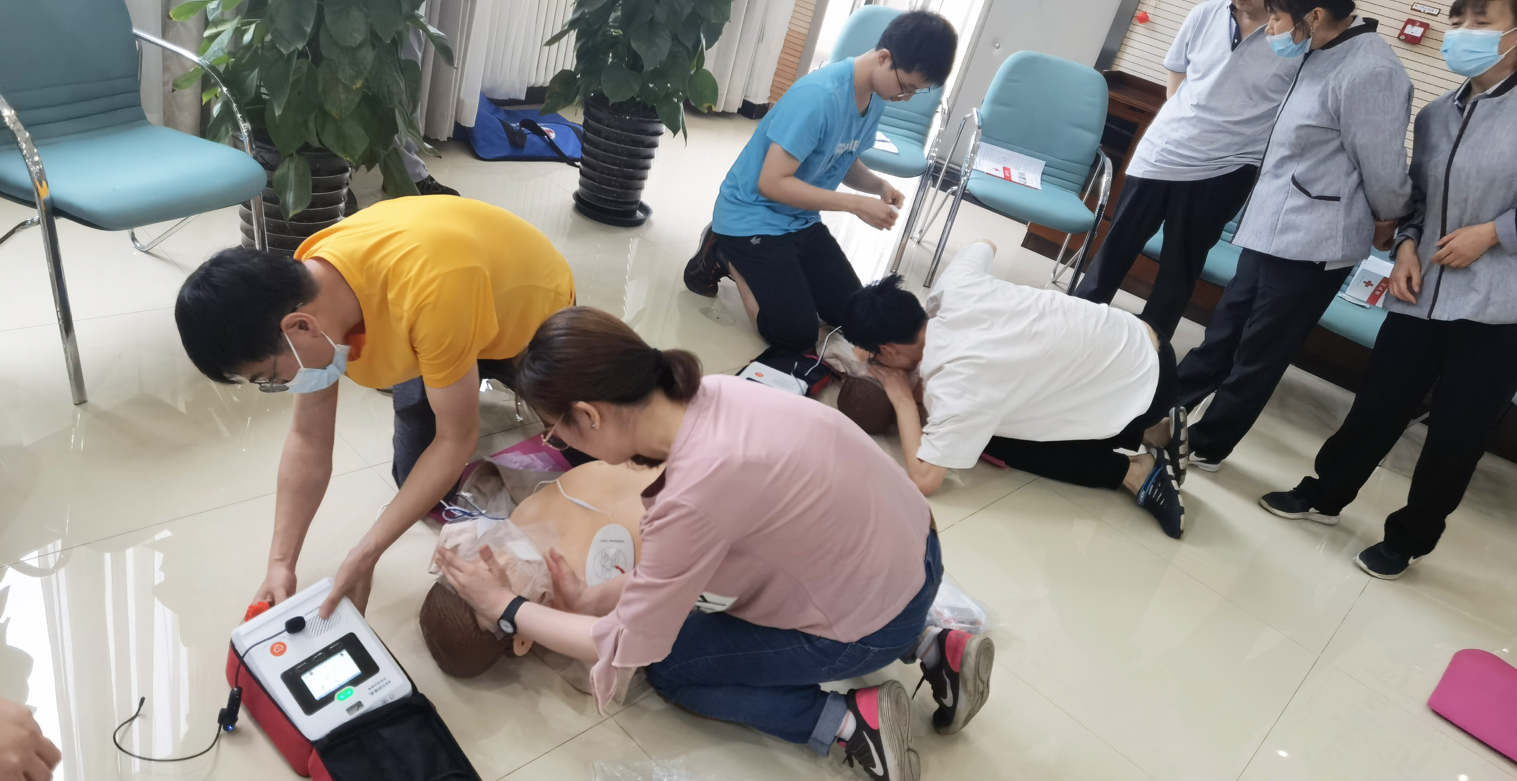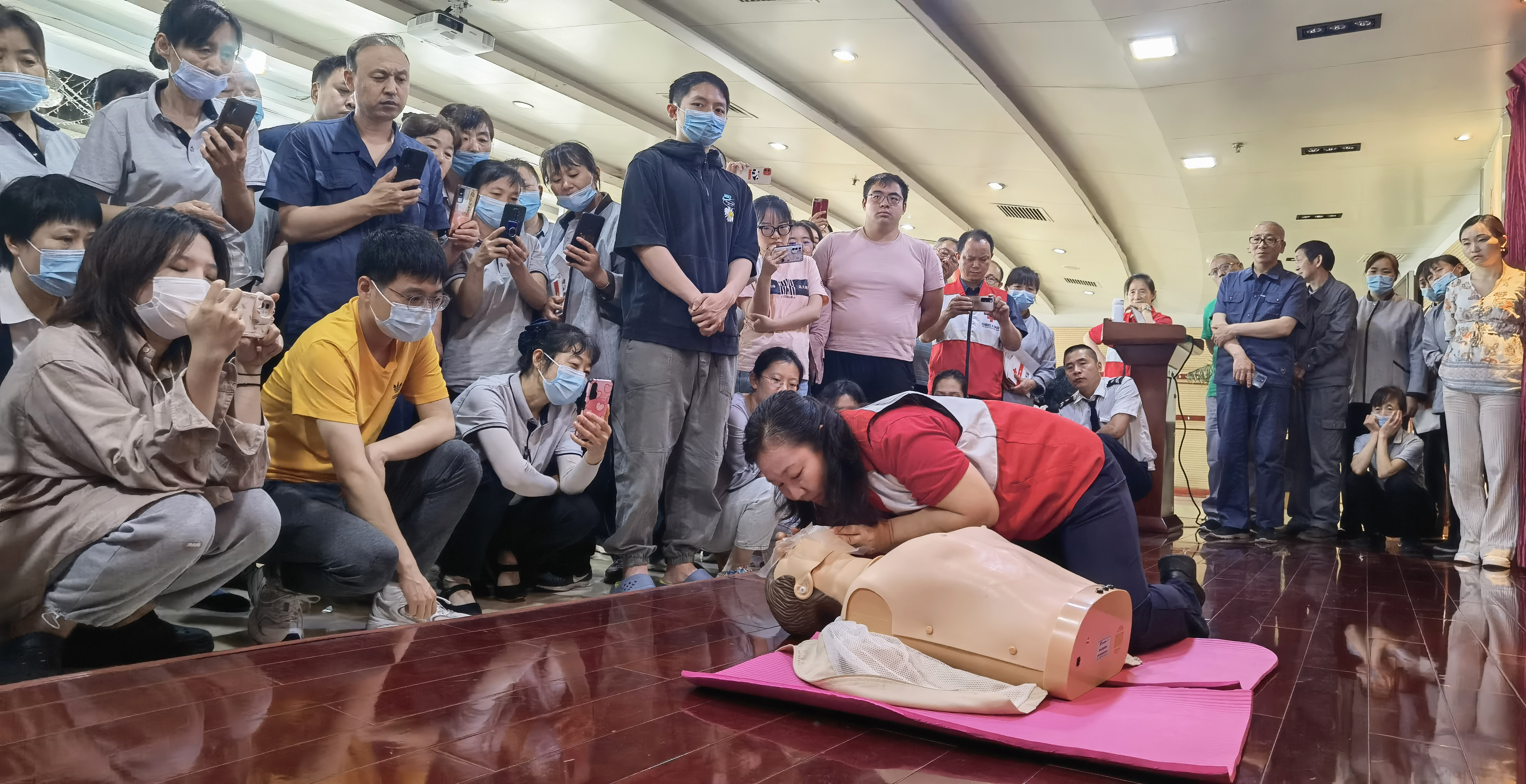 本次培训分为理论学习与实际操作两个部分。红十字会老师以生动形象、通俗易懂的培训形式对人体心脏供血原理;心肺复苏前注意事项;如何指挥周围人员协助拨打120,取用附近AED机;心肺复苏基本操作流程;AED设备使用步骤和注意事项等内容进行专业性讲解,并利用人体模型进行现场演示。