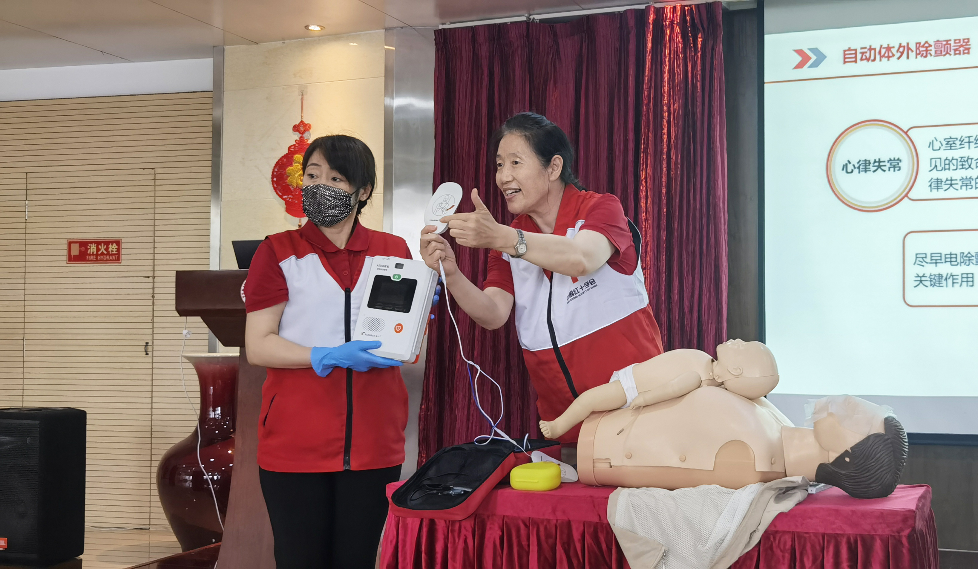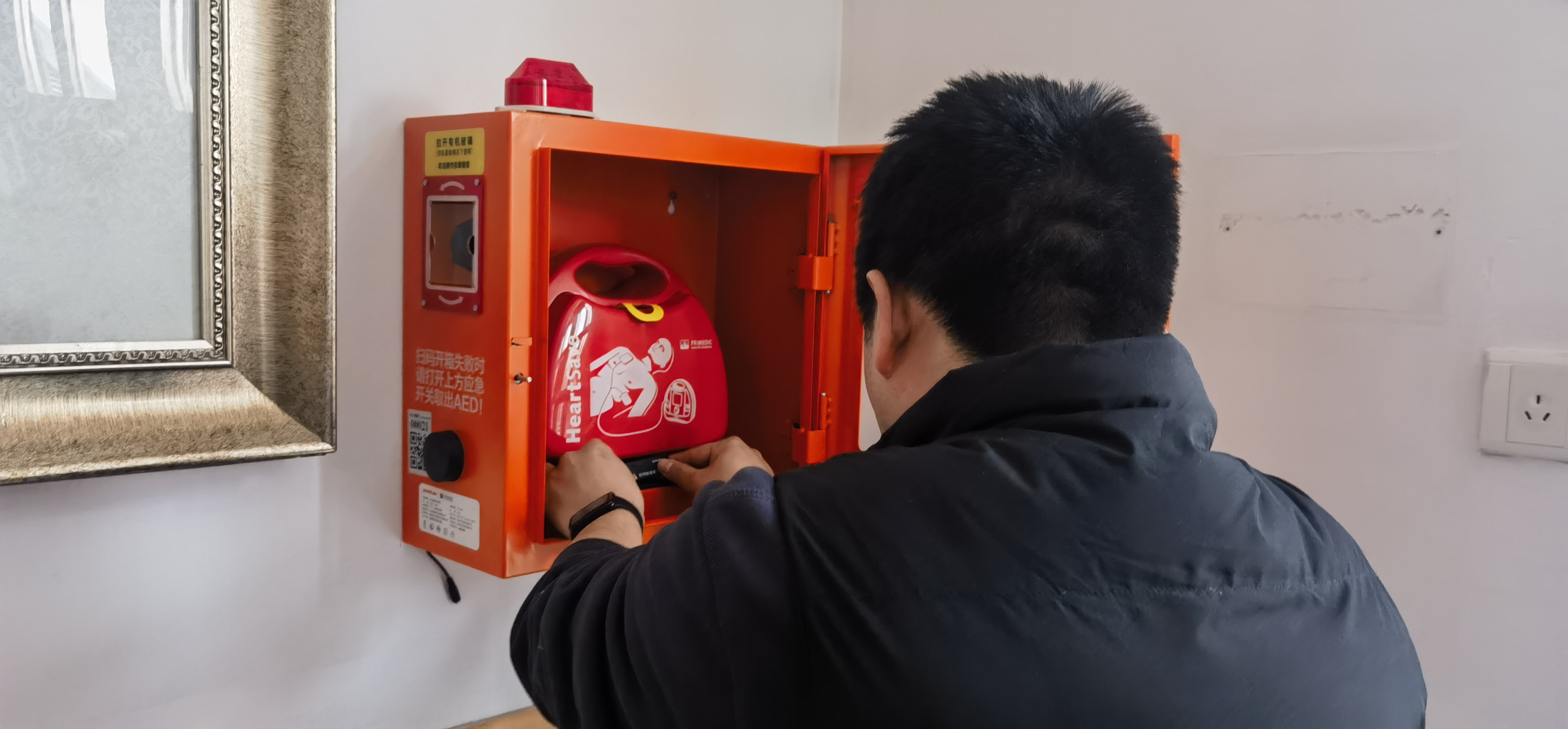 “安心守护 救在身边”,北大红会在万柳各区一层安装了AED设备供大家使用。AED全称自动体外除颤器,是一种便携式的用于抢救心脏骤停患者的医疗设备。非专业人员可利用AED,在最佳抢救时间的“黄金四分钟”内,对患者进行除颤和心肺复苏,帮助患者恢复心跳,制止猝死,提高抢救成功率。