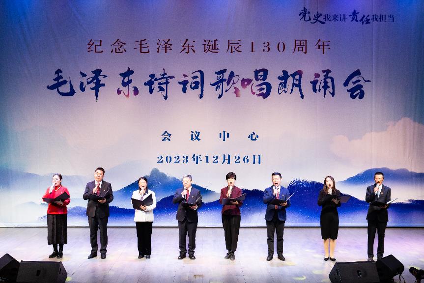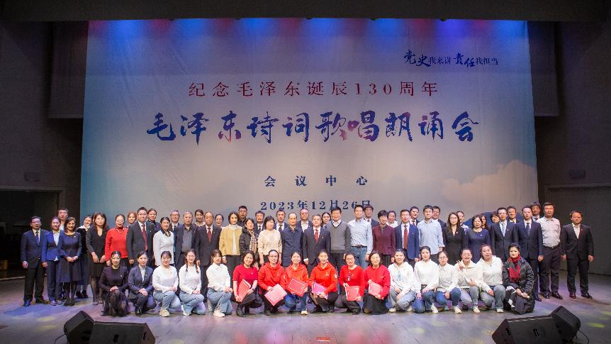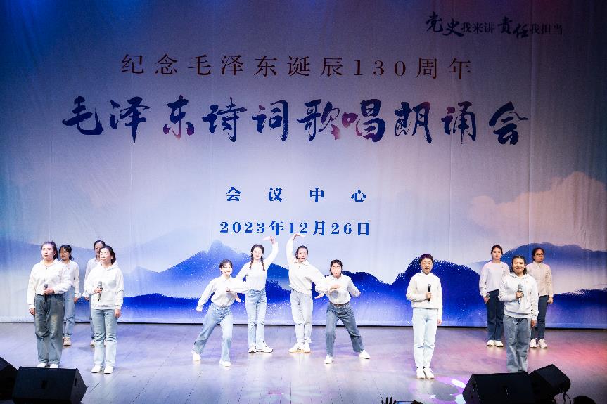 12月26日下午,为深入学习贯彻习近平文化思想,在纪念毛泽东同志诞辰130周年之际,会议中心党总支、工会联合策划在百周年纪念讲堂李莹厅举办了“毛泽东诗词歌唱朗诵会”。中心百余名党员和入党积极分子参与其中。学校后勤党委书记张念梅,党委宣传部副部长张琳,工会副主席丁伟忠、张小萌,总务部副部长张勇,后勤党委副书记、纪委书记、工会主席宋飞,后勤团委书记、房产部副部长汪一波,以及来自学校兄弟单位和会议中心的退休老同志,与中心近300名员工一道观看了演出。